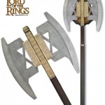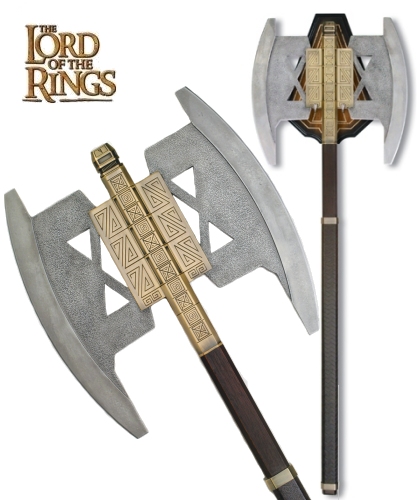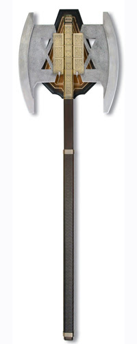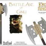 Known primarily for their innate abilities to smith metal and stone, Dwarves are proud and strong-willed, ready for battle at a moment’s notice. Like many Dwarves, Gimli, son of Gloin, favors the axe as his primary weapon. Accompanying his father to the Council of Elrond at Rivendell, Gimli is chosen to represent the Dwarves in the Fellowship of the Ring. After the Fellowship becomes separated, Gimli fights valiantly alongside Legolas and Aragorn from the Battle of Helms Deep to the Black Gates of Mordor. With his unshakable determination for success, he proves to be a valuable aid to the Fellowship. In Moria, after a cave-troll destroys the tomb of his forefather, Balin, Gimli is able to retrieve the mighty two-handed Battle Axe that had once belonged to the Dwarf-lord. From that point on, Gimli uses this Battle Axe for all close combat. Prepared for as many different situations as possible, he carries the Battle Axe with him, along with his Walking Axe, Bearded Axe, and two throwing axes. The massive head of this Battle Axe could be swung in both directions, making it a good choice for rapid moving combat.