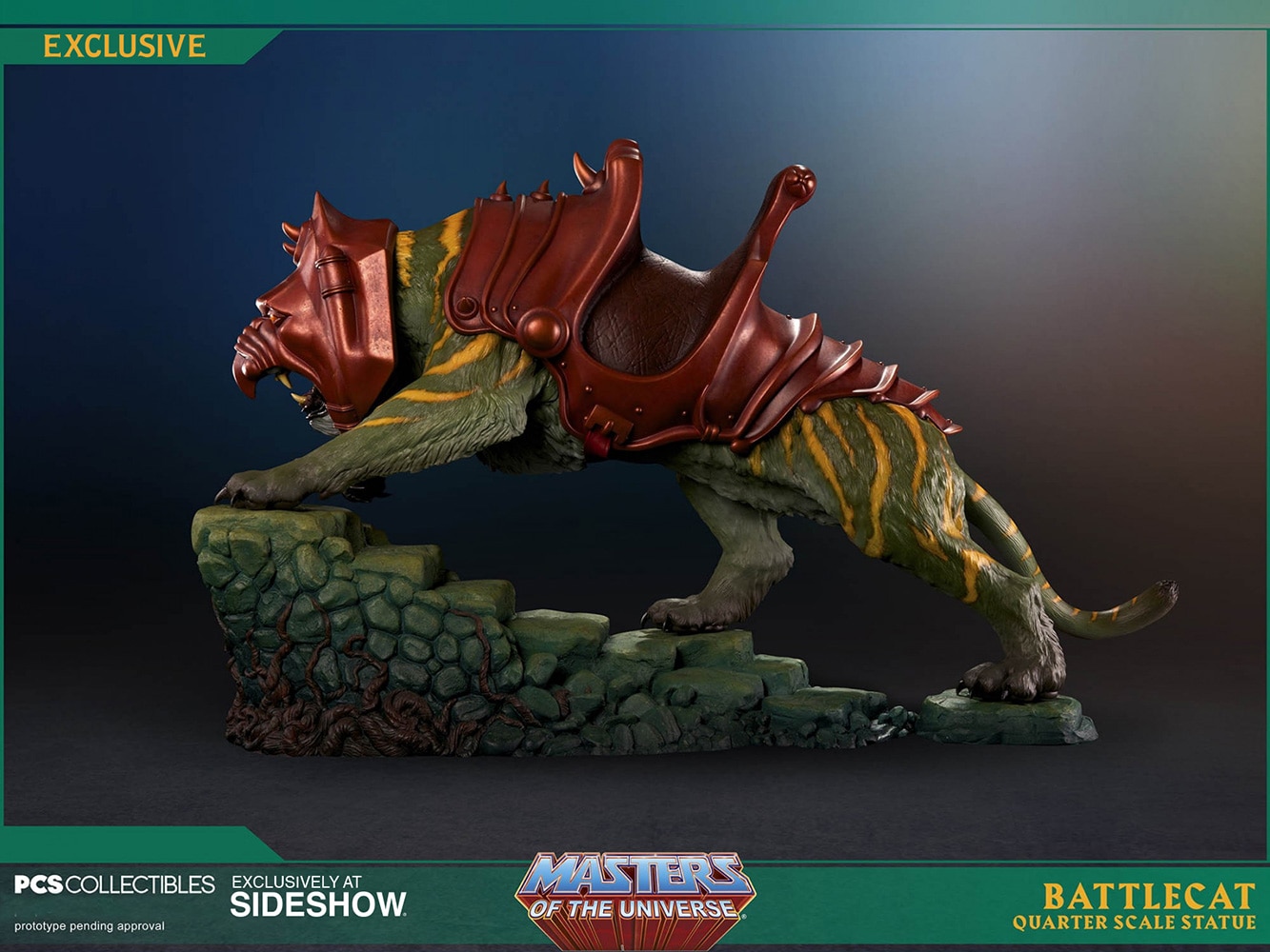 Pop Culture Shock Collectibles presents He-Man’s trusty steed – Battlecat! The Battlecat 1:4 Statue is approximately 33″ long and features a helmeted head.
