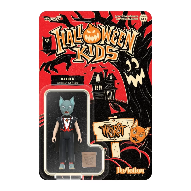 A young Batula Boy is lurking about this Halloween season, surely looking for some mischief! This articulated, 3.75” scale Halloween Kids ReAction Figure of Batula Boy features a young trick-or-treater dressed up as The Worst’s resident Bat Prince of Darkness and includes a candy sack accessory with Mummy Boy detail. Inspired by the vintage Halloween costumes from the 70s and 80s, you won’t need to be tricked into treating yourself to a trip down nostalgia lane with the Batula Boy Halloween Kids ReAction Figure!