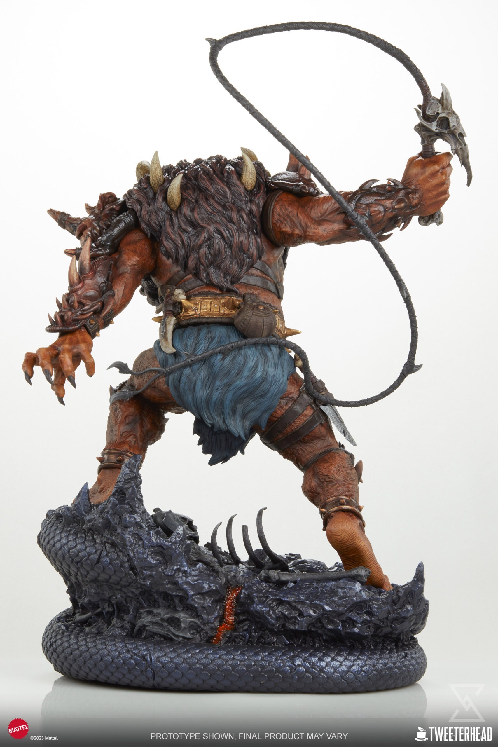 This new Beast Man Maquette measures roughly 19″ tall (top of his back) to 22.2″ tall (top of whip), 14.5″ wide, and 14.4″ deep when fully assembled – from the bottom of the base, to the top of the back or whip, to the furthest out points on the base and accessories.