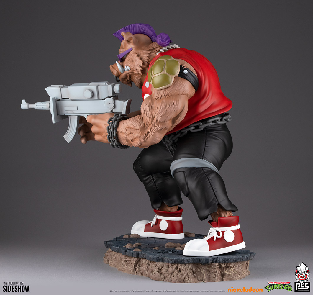 The Bebop Statue measures 16” tall and 12.5” wide, prepared to squeal and deal some serious damage to the heroes in a half-shell with his blaster. Under the leadership of the sinister Shredder, this mutated street gang member is toughed up and tusked up, wearing chains, grenades, and turtle shell shoulder armor. He additionally features a red vest, black pants, and purple shades to match his mohawk. Bebop is fully sculpted in immense detail that brings this colorful character to life in three dimensions, inspired by his classic animated appearance. Standing on a base of cracked flooring and rubble, this wild warthog brings his brand of brash and brutal strength to your shelf.