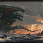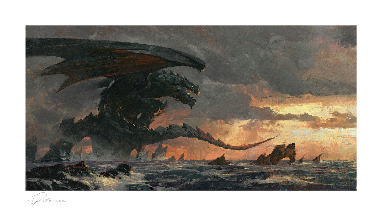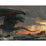 Inspired by fantasy classics to create his own stunning visions of far-off realms, Greg Rutkowski is known for his breathtaking contributions to the visual landscape of the genre. In Before the Storm, a fearsome black dragon settles on a rocky outcropping in the sea. Gloomy clouds billow above its wings, slowly choking out the warm haze of the sunlit sky. An omen of danger, the scaled beast brings a maelstrom of death and destruction to an unsuspecting world.