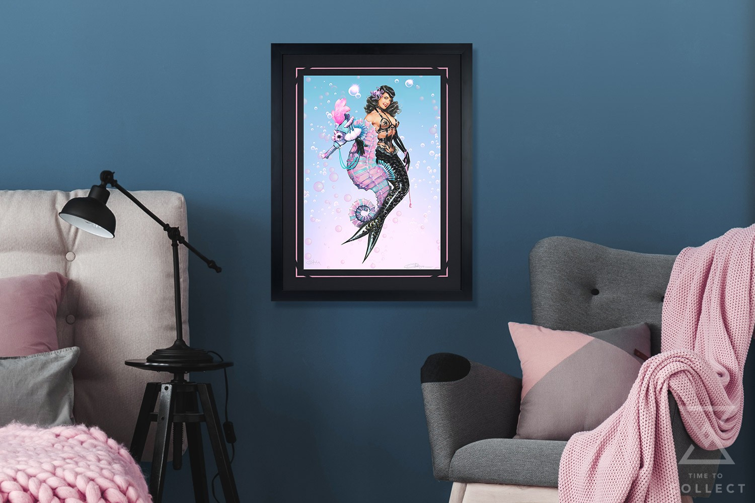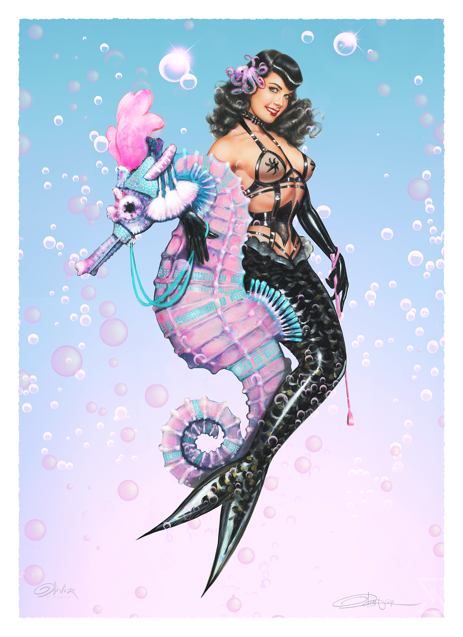 Feeling nauti? Pinup pioneer Bettie Page is one of Olivia’s most iconic and often-painted subjects, appearing in all sorts of scenarios and ensembles across the artist’s prolific portfolio. In this bubbly portrait, Page sits side-saddle on a colorful seahorse — as a mermaid! The marine scene features a bubblegum pink-and-blue palette, contrasting perfectly with the model’s black scales and body harness. A small octopus accents Bettie Page’s flowing hair and a pink riding crop rests gently in her hand.