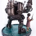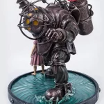 The BioShock: Big Daddy – Bouncer statue has been depicted as it is shown on the box cover art for the game with the Bouncer having its Drill at the ready and a Little Sister by its side.