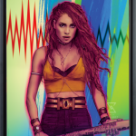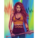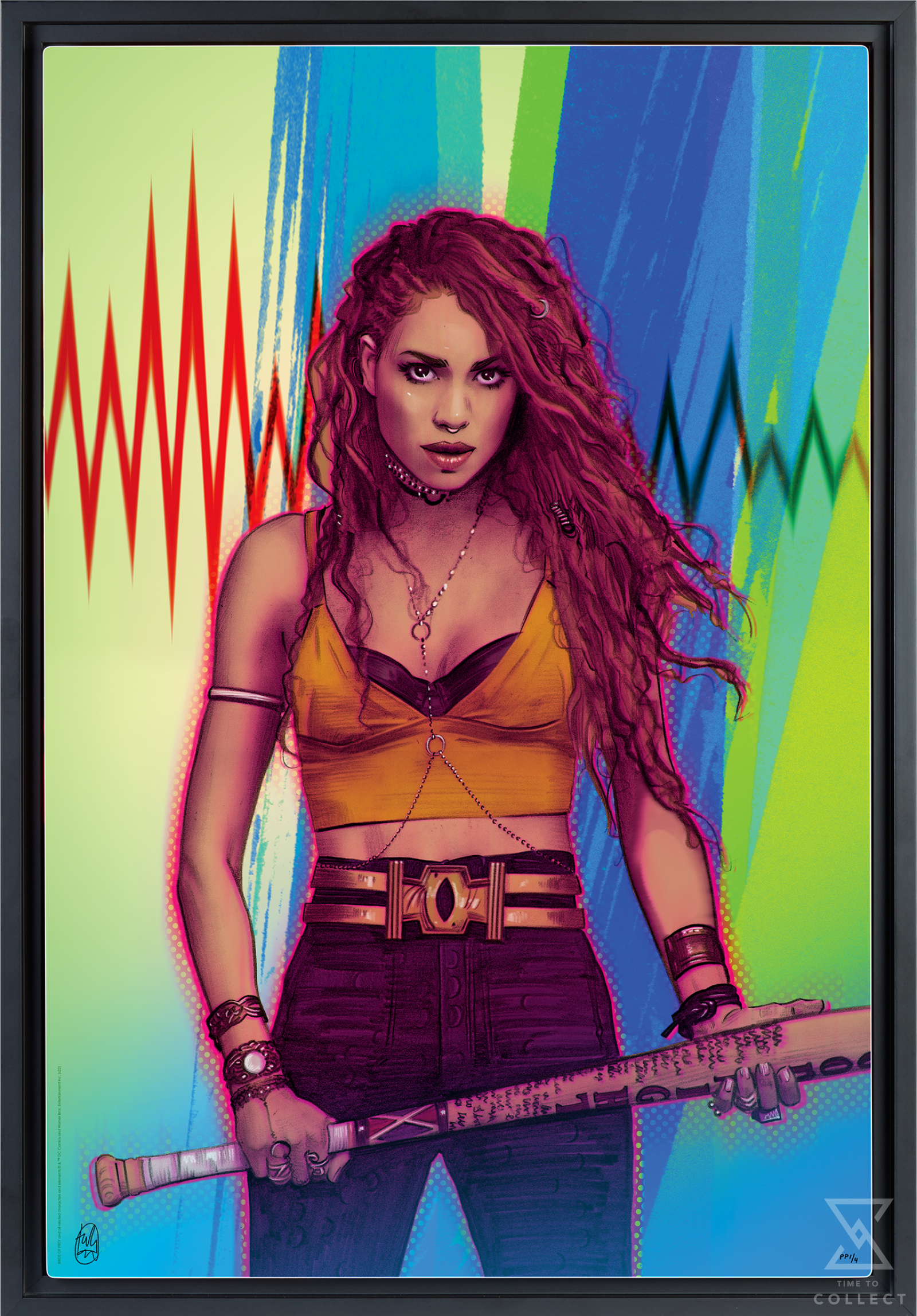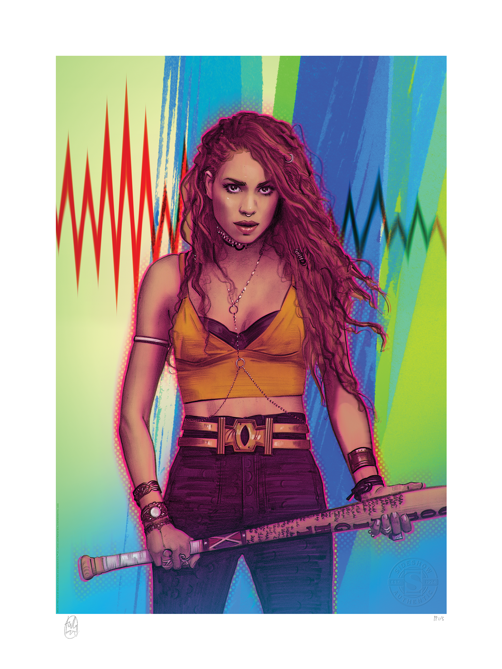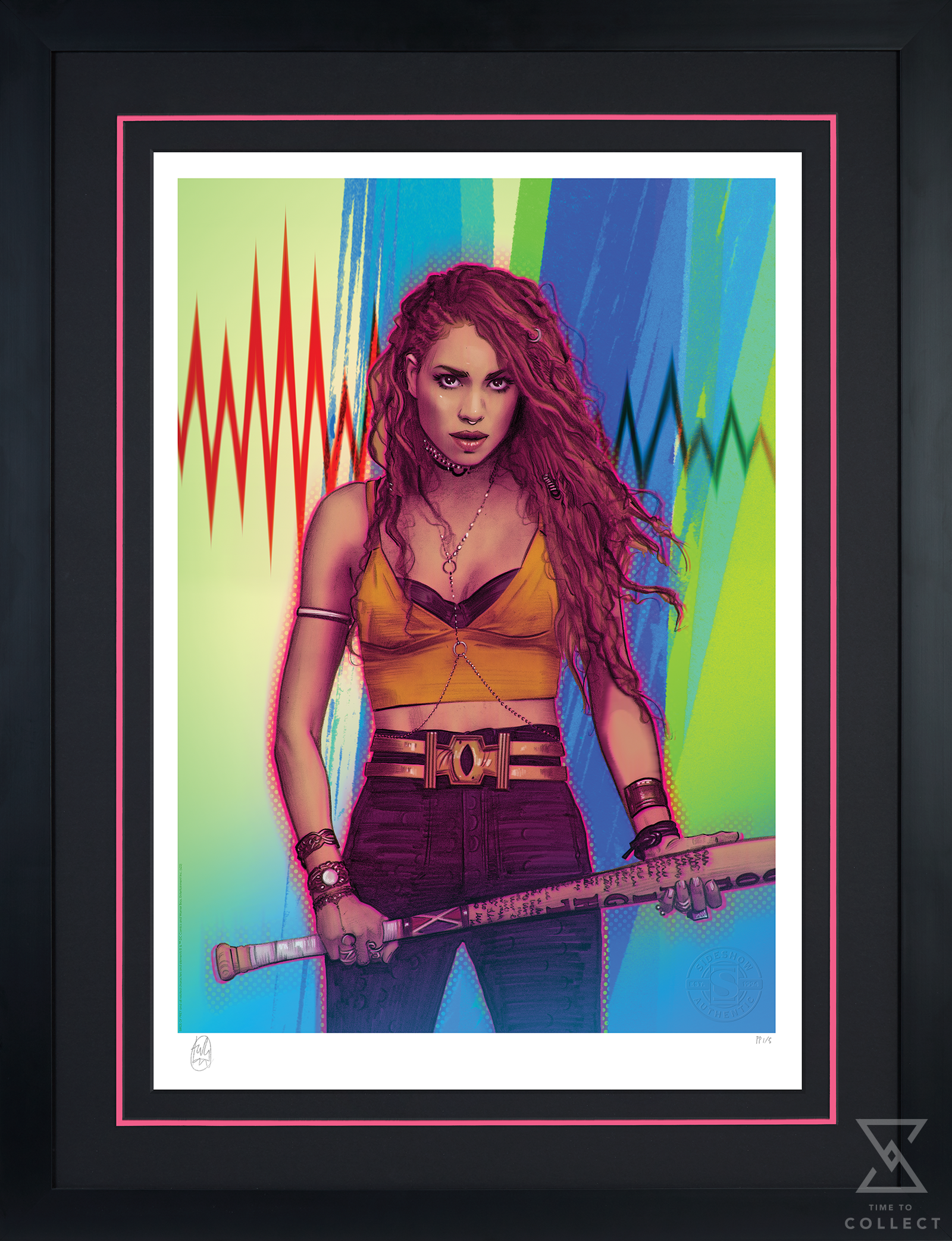 Told you she had a killer voice. Inspired by actress Jurnee Smollett’s live-action performance as Dinah Lance in Birds of Prey (And the Fantabulous Emancipation of One Harley Quinn), this vibrant portrait of the crooning crimefighter pops against a backdrop of acoustic waves — talk about surround sound! Armed with her sonic voice and Harley Quinn’s Good Night baseball bat, Black Canary is ready to shatter eardrums and kneecaps in the fight against her boss Roman Sionis, AKA Black Mask.