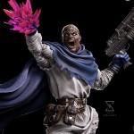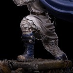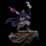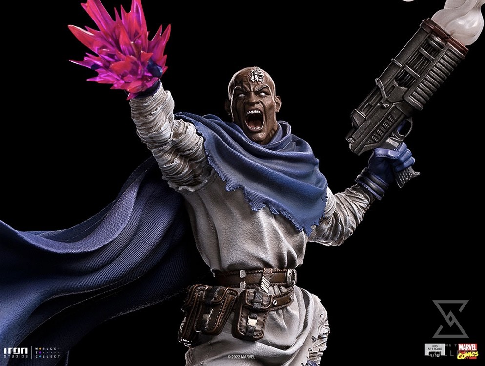 With the barrel still steaming after a shot, the time-traveler mutant wields in his left hand the original weapon he brought from another world’s alternate future he came from. In combat action, he projects an energy explosion absorbed by his body, in the form of a plasma ray burst from his right hand, showing the rage on his face. Wearing a white rustic garb, boots, a cloak with a blue cape, and a leather belt with pouches, he fights on a pedestal made by the steps of a metallic platform. Thus, Iron Studios bring the statue “Bishop BDS – X-Men: Age of Apocalypse – Art Scale 1/10”, with the version of the X-Men from the future, inspired by Marvel’s audacious comics saga from the 1990s.