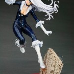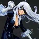 Black Cat is one of Marvel Comics’ most beloved beauties, first appearing in the pages of the Amazing Spider-Man in 1979. She is captured here in mid-leap across the skies of New York, a sultry combination of her comic book look and the bishoujo style. Leaning on one leg, Black Cat twists and balances herself in an alluring pose made all the better by her skintight costume complete with fringes at the neck, elbows, and knees. Her incredible mane of white hair flies out beside her in long tendrils that only slightly cover her striking Bishoujo-styled face (complete with authentic mask)!