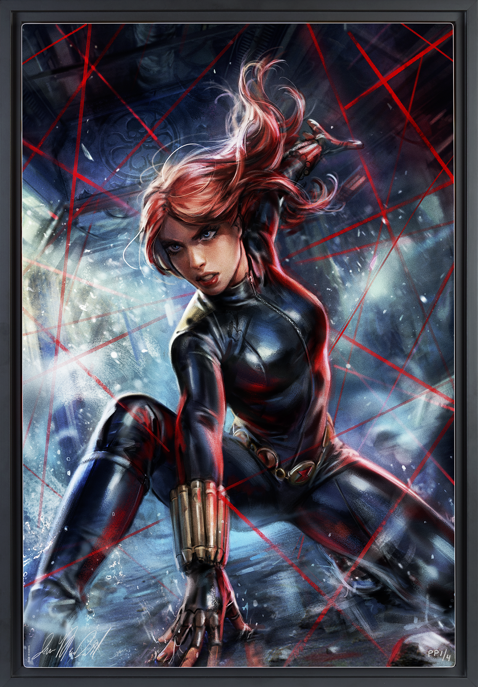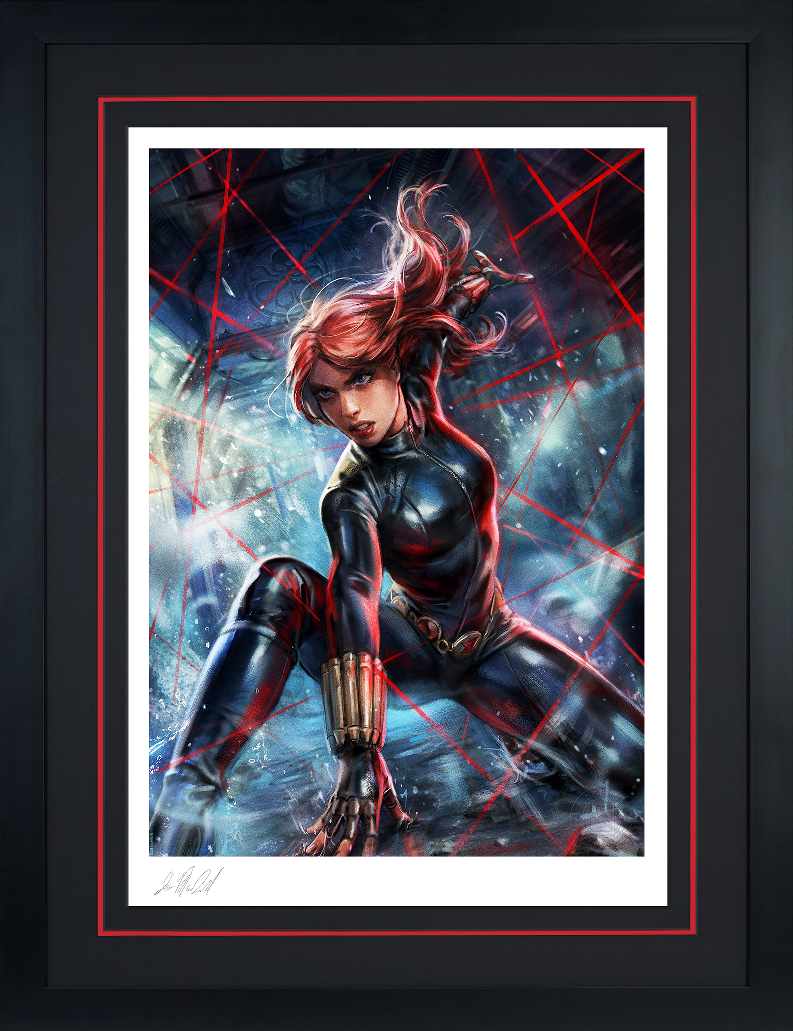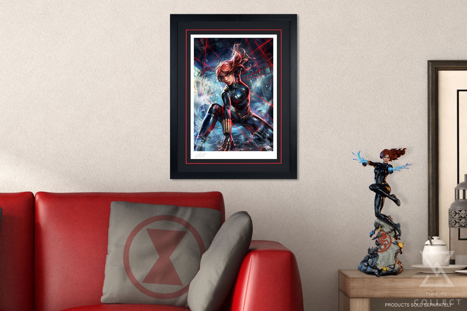 Each Black Widow Fine Art Print features an embossed Seal of Authenticity and an authorized, automated artist signature. This action-packed print is available unframed and in a custom framed format in a limited edition of 300 pieces. Additionally, collectors can pair this print with the Black Widow Premium Format™ Figure for the ultimate Black Widow display.