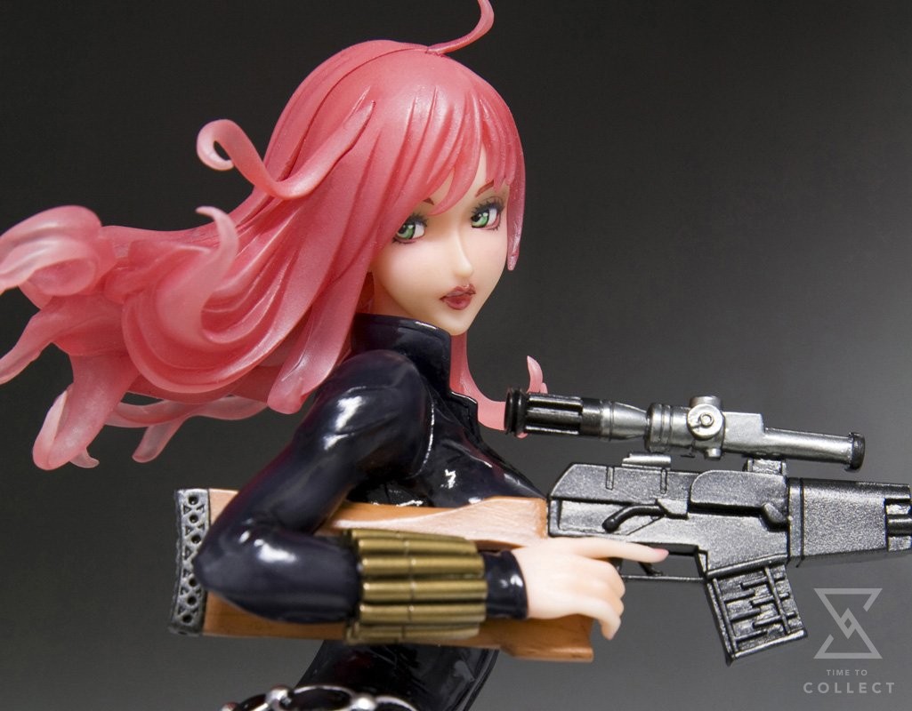 The beautiful but mysterious Black Widow has never looked better as she lures an unseen foe into her trap, preparing to vault over a low wall. The sexy Avenger wears her traditional skin-tight bodysuit that leaves little to the imagination, and of course it’s accented by her unique belt, wristbands that fire the “Widow’s Bite,” extra ammunition strapped to her thigh, and built in high-heeled boots! Her entirely new sculpt brings an unprecedented feeling of action and movement (highlighted by her swirling hair), and of course Black Widow’s adorable Bishoujo-inspired face will stop you in your tracks. Interchangeable parts even let you display Natasha with or without her fearsome rifle!