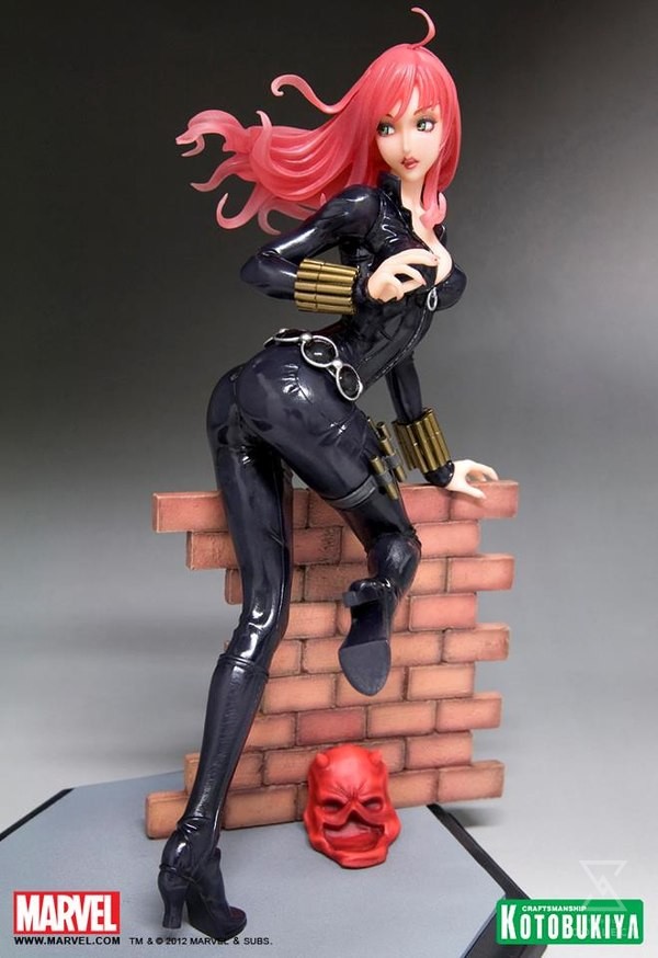 Sculpted by Masahiro Takahashi, the new Covert Ops Black Widow stands over 8 inches tall in 1/7th scale with the current and future Marvel Bishoujo Statues. Her exclusive display base features a broken chunk of wall as well as a hint about Natasha’s complicated past: a Daredevil mask!