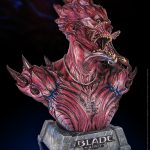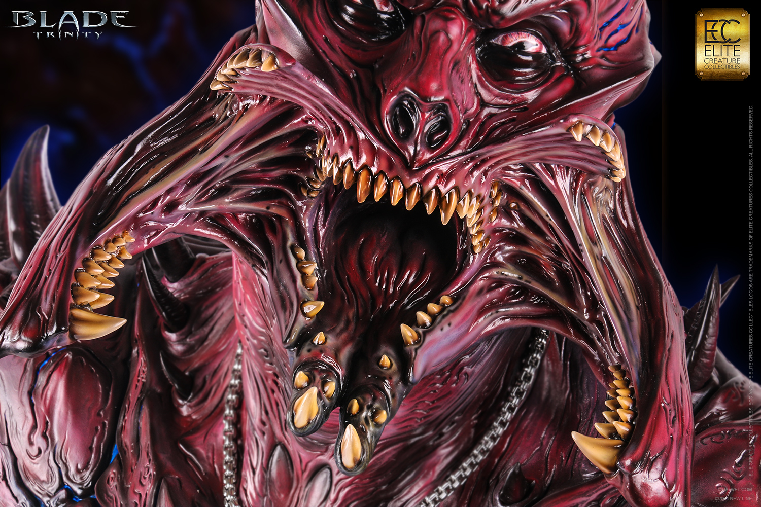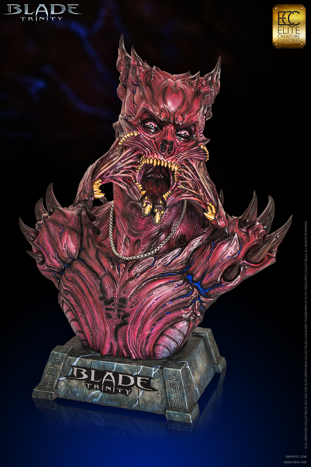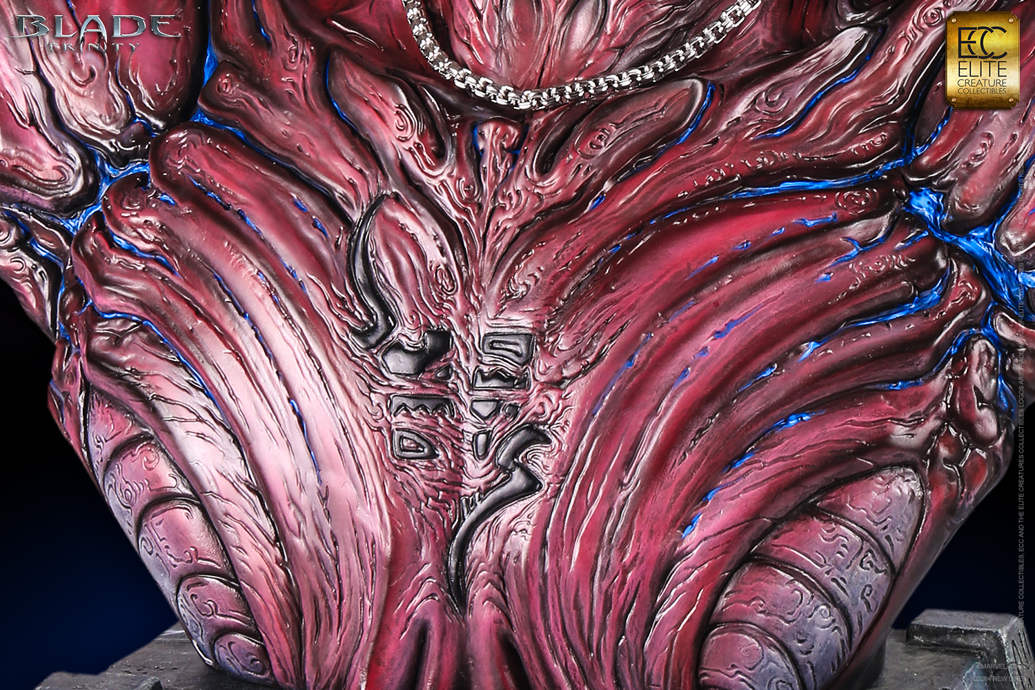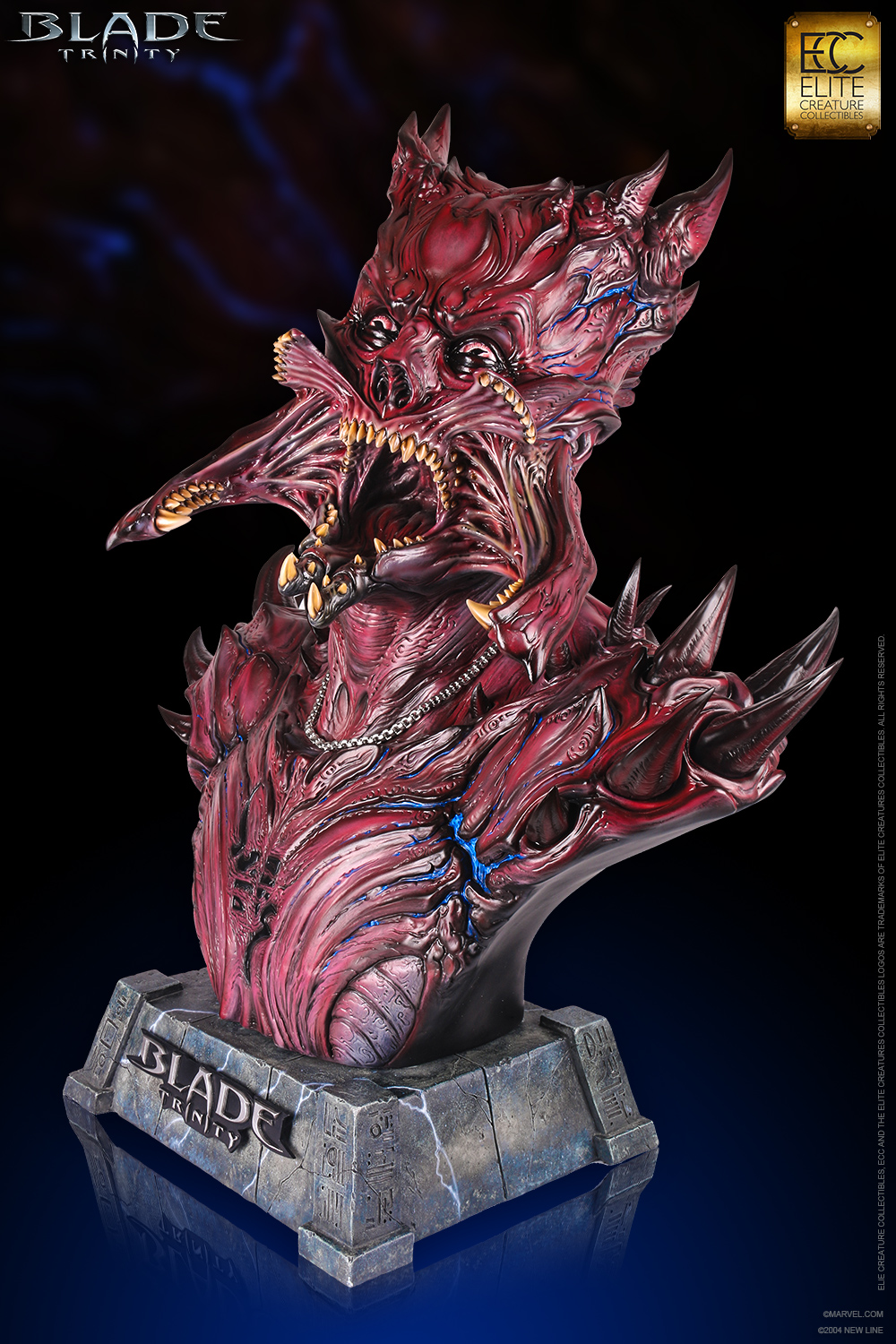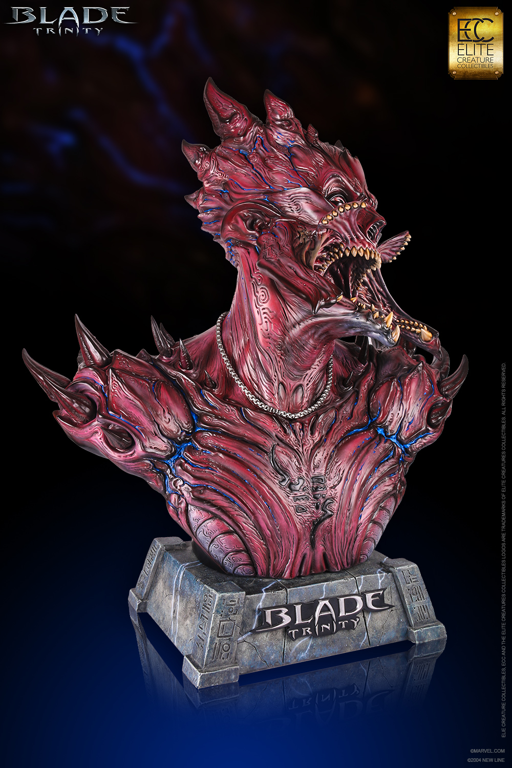 Elite Creature Collectibles is very excited to introduce its life-size bust of Drake – the ancient Sumerian warrior king – awoken by the sculpting blade of Special FX Master Steve Wang! Standing an imposing 32″ tall, the Blade Trinity Drake bust presents the world’s first vampire in his ancient demonic form, complete with authentic armoured hide and chitinous skin.