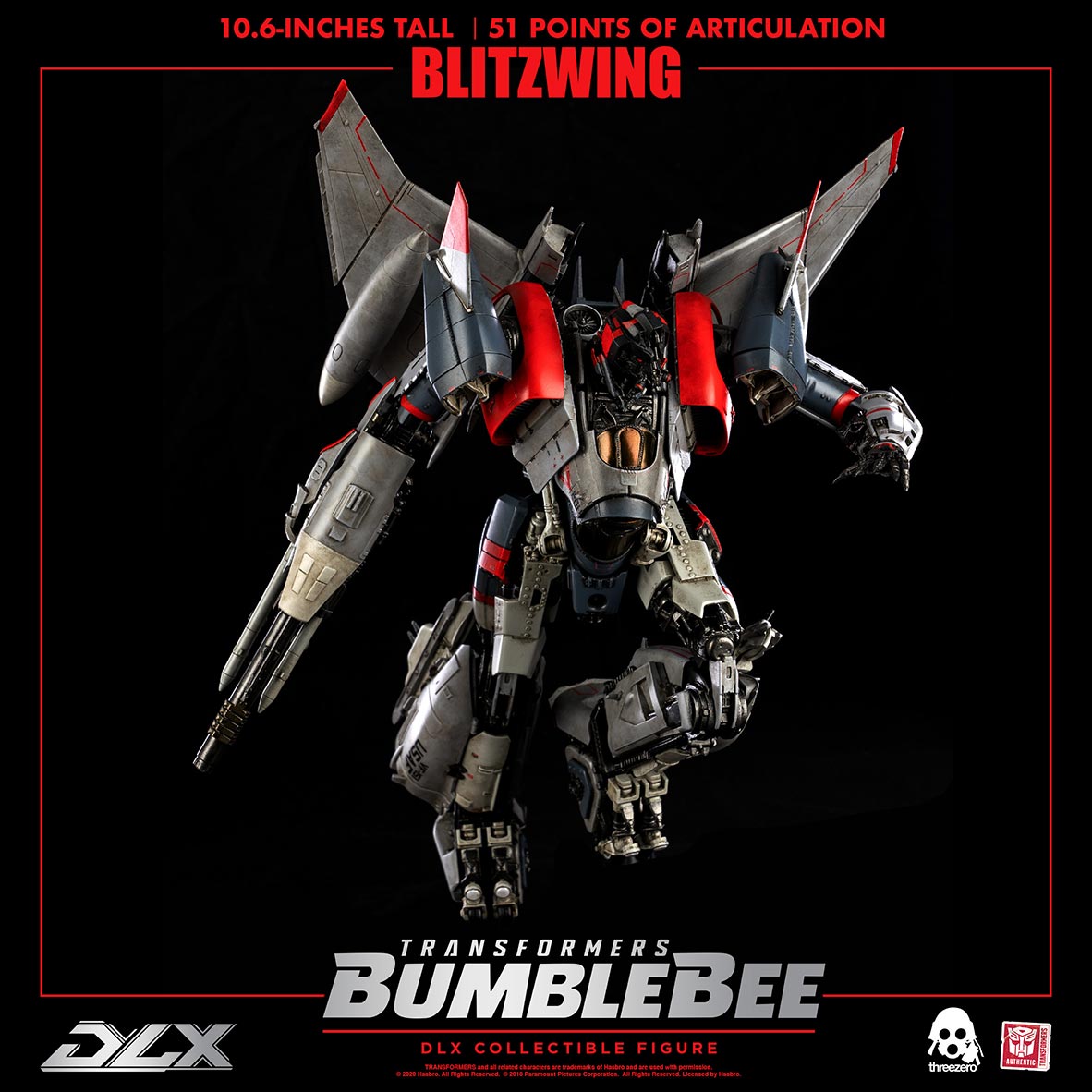 DLX Blitzwing stands 10.6 inches tall and features screen accurate detailing, 51 points of articulation, LED illuminated eyes, and die-cast metal parts! Blitzwing comes fully equipped to hunt and seek Bumblebee with his interchangeable Null-ray Blaster and the surgically precise Electron Spike Blade!