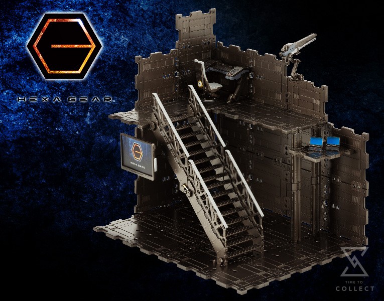 Kotobukiya is proud to present a 1/24 scale Hexa Gear base expansion pack. Use this set to freely create battle scenes, briefing scenes, machinery maintenance scenes, etc. with other Governors or Hexa Gear. With the two types of 75mm×150mm base plates (plain flooring and detailed walls) in addition to the HEXA G-R.A.M attachment, users can freely expand the base in all directions. Furthermore, with other options such as the staircases or lifts for this base, users can create a Hexa Gear storage hangar or a battleground for Governors; the possibilities are endless. This DX HEAD QUARTERS includes various small accessories such as a large monitor, chair, control panel, etc. to further emulate a base of operations. A sentry gun is also included in this set. The monitors of the laptop terminals are able to be opened and closed which demonstrates the high level of craftsmanship that went into these accessories despite its small size. The large monitor was designed to allow printed inserts so users can insert images of their choosing cut into the designated size to further emulate a mission briefing within this base. The mounted sentry gun is made with 3mm joints for flexible movement and depending on the HEXA G-R.A.M, can be mounted on other Hexa Gear models.