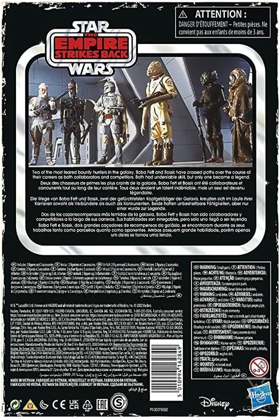 2 of the most feared bounty hunters in the galaxy, Boba Fett and Bossk have crossed paths over the course of their careers as both collaborators and competitors. Both had undeniable skill, but only one became a legend. Kids and collectors can imagine the biggest battles and missions in the Star Wars saga with figures from Star Wars Retro Collection! With exquisite decoration, this series embodies the quality and realism that Star Wars devotees love. Star Wars Retro Collection includes figures from the 40-plus-year legacy of the Star Wars Galaxy, including movies and live-action series. (Additional products each sold separately. Subject to availability.) The 3.75-inch-scale Retro Collection figure is detailed to look like the Boba Fett & Bossk characters from Star Wars: The Empire Strikes Back, featuring design and detailing inspired by 1970s Star Wars figures.