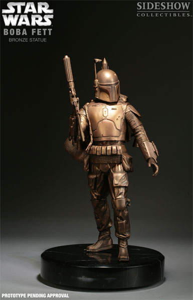 Sideshow Collectibles is proud to present the Boba Fett Bronze Statue, capturing the mysterious bounty hunter as he appeared in Return of the Jedi. This impressive piece stands approximately 21 inches tall atop an environmental display base reminiscent of Jabba’s palace. Every detail of Fett’s Mandalorian armor has been reproduced in true scale, as well as his jetpack and braided wookiee pelt trophies. The Boba Fett Bronze Statue is the definitive Fett collectible, the perfect centerpiece for any Star Wars collection.