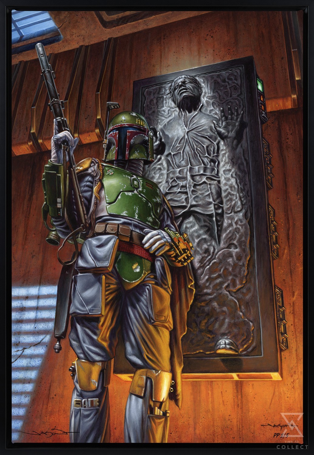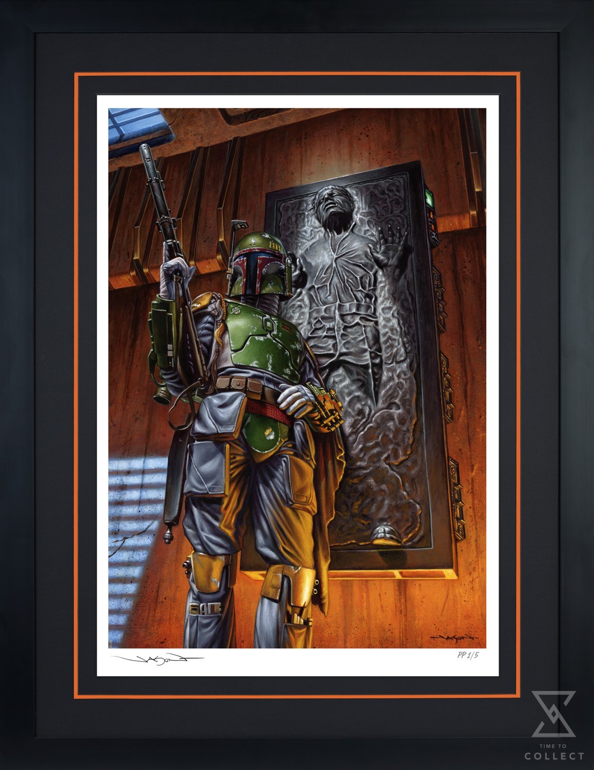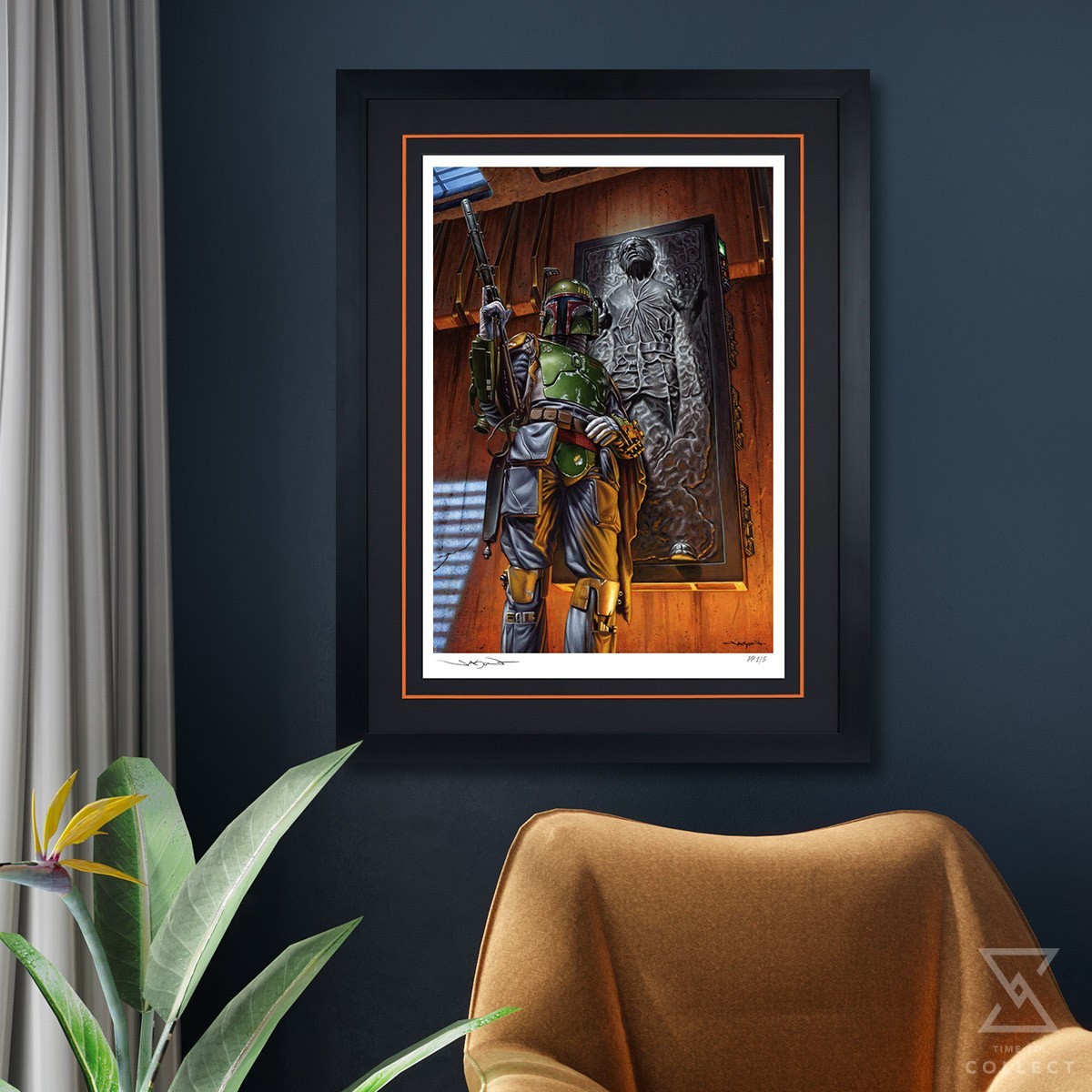 Inspired by The Empire Strikes Back™, this Star Wars art is now available to fans as an unframed giclée print or in a custom framed presentation. Each Boba Fett: The Bounty Fine Art Print features an authorized, automated artist signature and an embossed Sideshow Seal of Authenticity as part of the limited edition of 350 pieces. Pair it with the Boba Fett and Han Solo in Carbonite Premium Format™ Figure by Sideshow — sold separately — for a display worthy of a Tatooine™ palace.