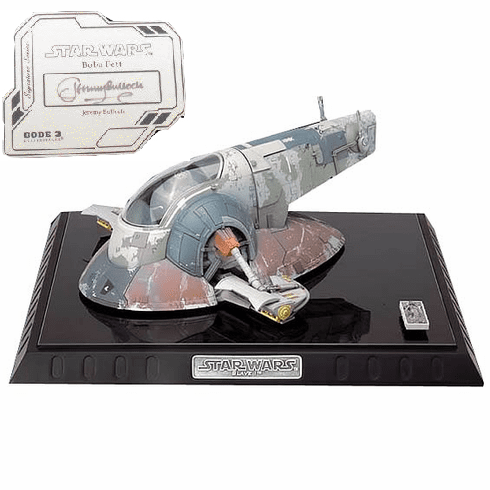 Limited to 500 pieces. This special edition of Slave I comes with a signature plaque signed by Jeremy Bullock, Boba Fett. You can own Boba Fetts distinctive starship Slave I from Episode V The Empire Strikes Back. This exotic weathered starship is full of surprises, just like its owner. You can open panels with your specialized magnetic tool to expose the stolen military secret sensor jamming unit, the virtually inescapable tractor beam generator, the robust engines, target scanner systems and the concealed proton torpedoes. Slave Is cockpit rotates as it goes from flight mode, in a vertical attitude, to a landing position with its engines down. You can also rotate Slave Is wings and short range twin blaster cannons. With your model of the deadly Slave I, you also receive a customized display stand and base, Boba Fetts bounty hunter patch, a specialized magnetic tool, limited edition certificate and Han Solo encased in carbonite. Dont miss out on owning one of the most lethal and unique starships from the Star Wars saga!