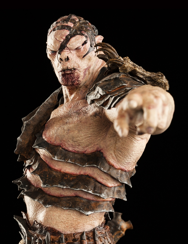 Spawn of the dreaded Orc chieftain Azog, whom they call the Defiler, Bolg is a towering brute with slashed skin, a rotted stub for a nose, and a baleful, single-eyed stare. Crudely bound with strips of torn and bolted steel, Bolg’s shattered skull is home to cruel intelligence, no less ugly than his riven visage. Tall for his kind, he looms menacingly over the lesser Orc minions under his command. As a lieutenant in service to the shadowy Necromancer, Bolg scours the wilderness between Dol Guldur and the ancient Orc fortress at Gundabad.
