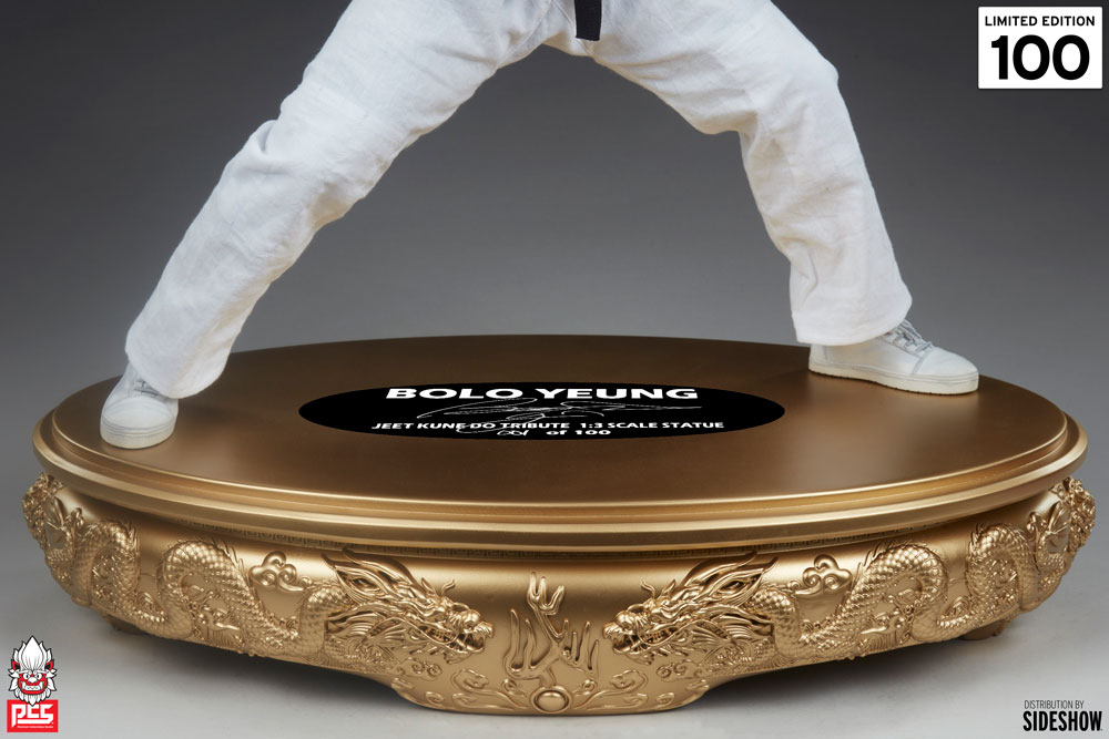 Inspired by an iconic era of his prolific career, the Bolo Yeung: Jeet Kune Do Tribute Autograph Edition 1:3 Statue is a mixed media collectible with a fully sculpted athletic physique costumed with white fabric gi pants and a black fabric belt to signify his martial arts accomplishments. As a practitioner of Jeet Kune Do, a martial arts philosophy founded by Bruce Lee, he strikes a wide stance, light on his feet as he flexes his muscles. Bolo Yeung’s portrait features a stern expression and a short style haircut sculpted to frame his face. He stands on a gold-colored base with sculpted dragon details. Limited to an edition of only 100 pieces, this collectible statue makes a perfect centerpiece for any fan’s action movie display.