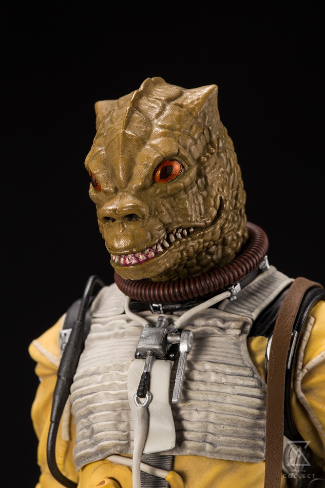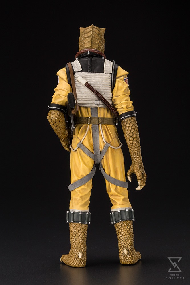 A Kotobukiya Japanese import! Star Wars ARTFX+ Statues bring you all of the quality and detailing that you expect from an ARTFX release in a great smaller scale perfect for collecting! The series has already brought you amazing heroes, villains, and troopers from the classic trilogy and beyond, and now you can collect the bounty hunters summoned by Darth Vader to track down the Millennium Falcon in Star Wars Episode V: The Empire Strikes Back. Joining the lineup after the two droids and Zuckuss is the reptilian Trandoshan Bossk! The cruel bounty hunter and loner is a menacing figure, standing straight and tall while wearing his yellow pilot suit. Bossk’s scaled yellow/brown hide is revealed at his lower arms and legs, too long to fit into a standard outfit, and all of his limbs end in large claws. As if his glaring red eyes and mouth full of sharp little teeth aren’t frightening enough, the bounty hunter carries his signature Relby-v10 mortar gun to deal with any… inconveniences. Bossk is intricately detailed from head to clawed toe with textured scales, creases and gadgets on his uniform, and so much more.