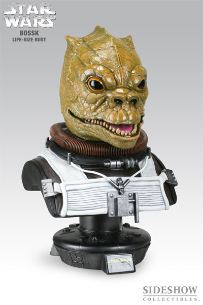 The life-size Bossk bust captures every pitted and weathered scale of Bossk’s leathery hide, expertly reproducing the original mask used to bring life to the bounty hunter in The Empire Strikes Back. The Bossk is cast in fiberglass with a polystone skin, capturing all the detail of the original sculpture. The bust is mounted on a Star Wars inspired display base, including a ‘Bossk’ nameplate. The hand crafted, hand painted life-size Bossk bust is sure to become the centerpiece of your Star Wars or bounty hunter collection.