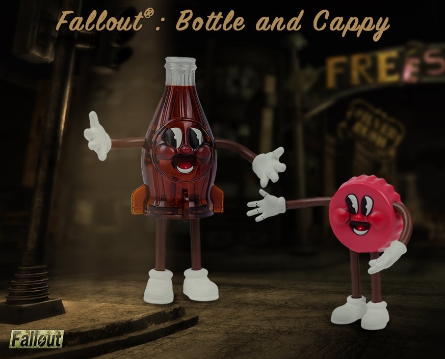 Who’s ready to have loads of F-U-N? Now you can spend time – all the time – with your favorite Nuka-World mascots, Bottle and Cappy, quenching your thirst for adventure. The Bottle and Cappy PVC figures come with bendy arms and legs so you can pose them anyway your heart desires.
