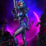 When you’re an assassin of this caliber, camouflage is for the weak. The polystone Bounty Hunter statue is equipped for tracking in any alien environment with a highly detailed white, blue, and purple bodysuit integrated with technological implants and support systems. Protected by a rocket-engine backpack, armor, and jump-jet boots, no atmospheric or job-related pressures can phase her. Her cropped haircut is dyed pink and blue, and she has a fierce, calculating look on her face. In her right hand, the Bounty Hunter carries her most important tool of the trade- a large blaster rifle bought with hard-earned credits from countless successful captures, affectionately dubbed Big Bang Betty.