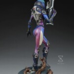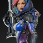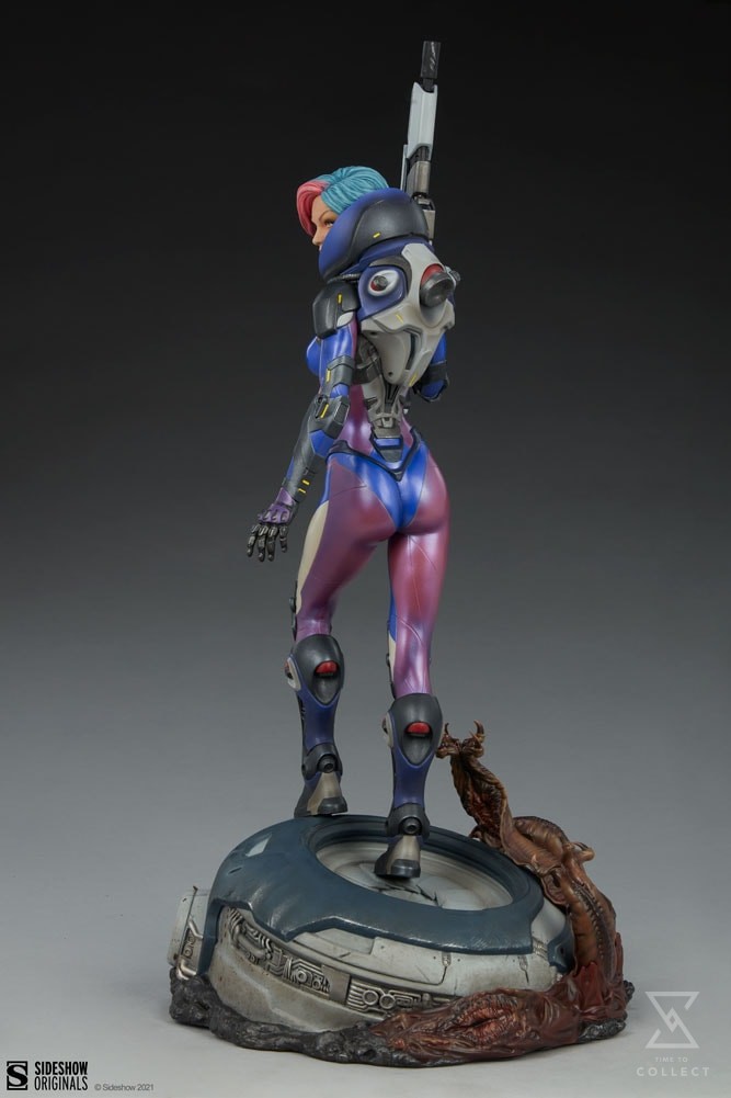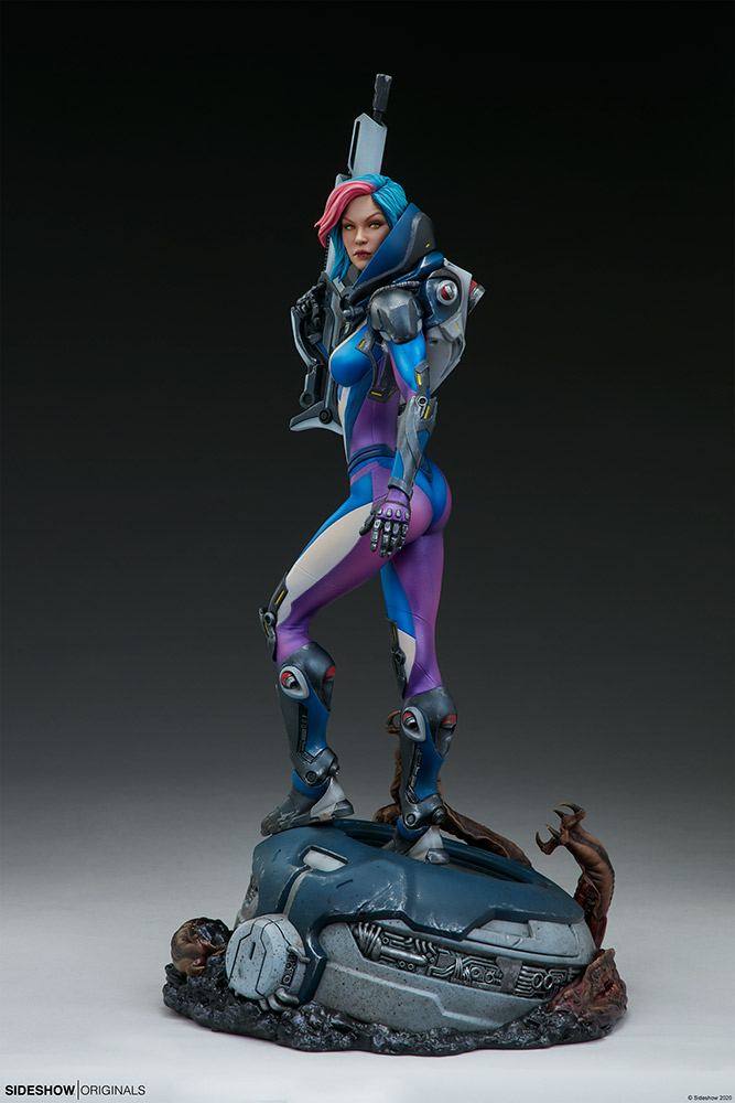 When you’re an assassin of this caliber, camouflage is for the weak. The polystone Bounty Hunter statue is equipped for tracking in any alien environment with a highly detailed white, blue, and purple bodysuit integrated with technological implants and support systems. Protected by a rocket-engine backpack, armor, and jump-jet boots, no atmospheric or job-related pressures can phase her. Her cropped haircut is dyed pink and blue, and she has a fierce, calculating look on her face. In her right hand, the Bounty Hunter carries her most important tool of the trade- a large blaster rifle bought with hard-earned credits from countless successful captures, affectionately dubbed Big Bang Betty.