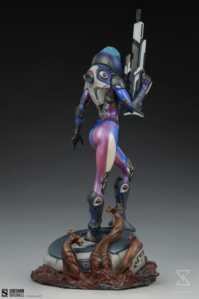 The Bounty Hunter: Galactic Gun for Hire Statue measures 19” tall, swaggering out of her spacecraft after an artful crash-landing on a hostile alien planet. Some of the native fauna doesn’t take kindly to the intrusion, reaching up with clawed tentacles to grab at her from beneath the ship. Undeterred, the fearless expert tracker confidently surveys the landscape in pursuit of her target, armed with her trusty blaster and a state-of-the-art space adaptation suit.