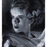 Despite her brief screen time in 1935’s sequel The Bride of Frankenstein, actress Elsa Lanchester brought life to a figure yet to be fully imagined even within the confines of Mary Shelley’s original novel. This monochromatic portrait captures the striking features and enthralling mystery of the reanimated monster’s mate, from her wide eyes and dark lips to the white bolt-like streaks of hair across her temples. Valentine’s brush strokes and layering of light and shadow spotlight the character in a way that recalls the tradition of black and white filmmaking.