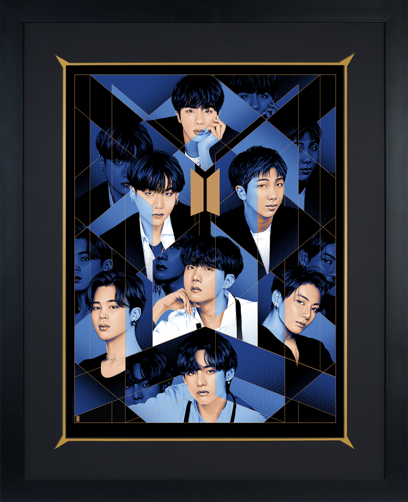 This screenprint is inspired by the album BE, a message of comfort, released in 2020 during a global pandemic. The cool blue tone of the BTS: BE Fine Art Screenprint represents sadness, fear, and anxiety while the warm gold represents determination and energy. The BTS: BE Fine Art Screenprint is an 8-color print on holofoil paper, creating a high-quality composition with an eye-catching execution. Available unframed or in a custom framed presentation, the BTS: BE Fine Art Screen print makes a highly collectible addition to any home display.