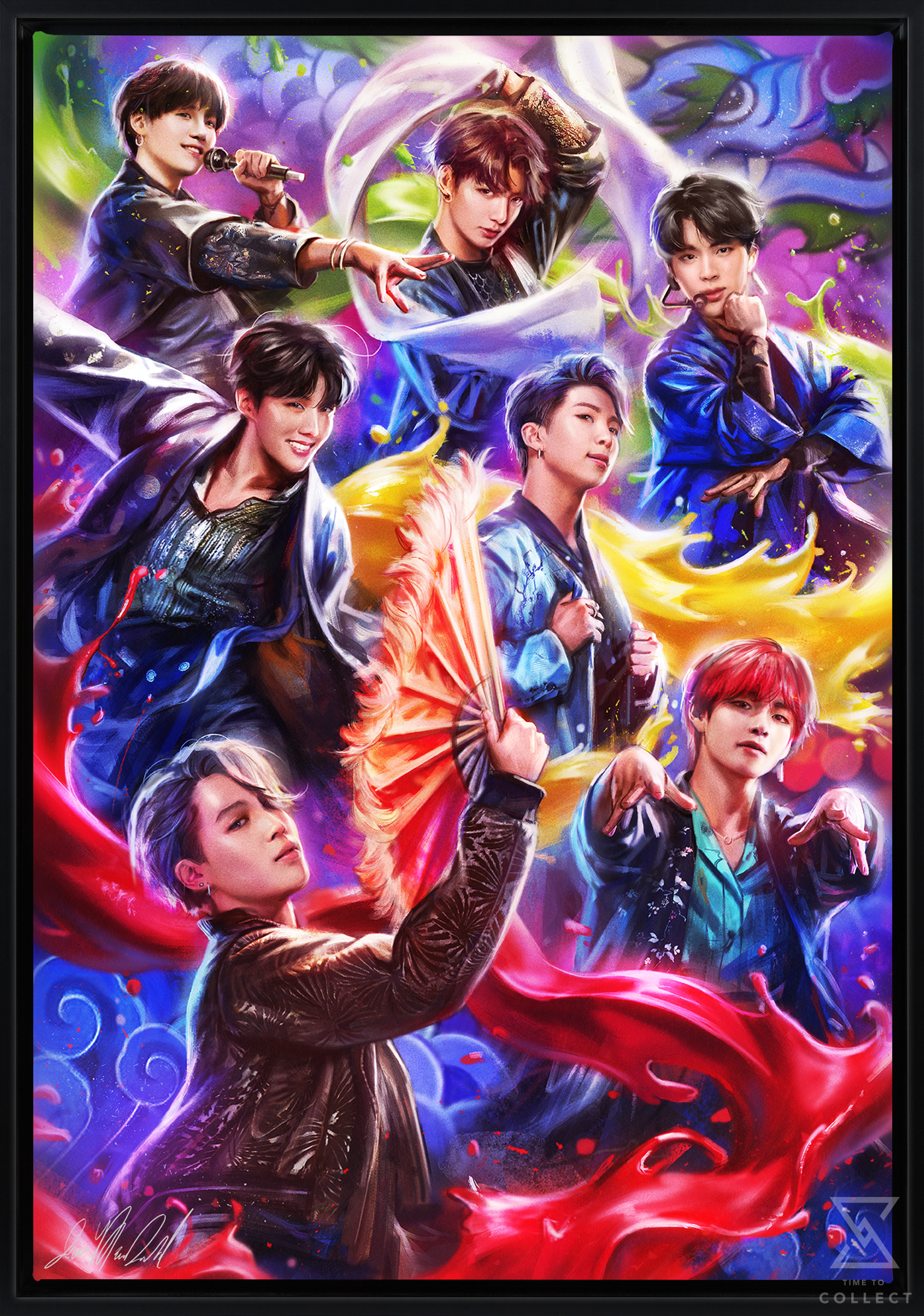 Inspired by the jaw-dropping visuals of the band’s iconic live show in 2018, the BTS: IDOL Fine Art Print celebrates the talent and energetic presence of RM, Jin, SUGA, j-hope, Jimin, V, and Jung Kook. This colorful composition incorporates many beautiful aspects of their performance into one dazzling collage, including the traditions of Korean culture that BTS brought to the stage during the unforgettable presentation of their iconic single.