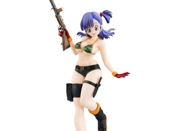 Bulma confidently shows off her figure in her camouflage bikini top and cropped jean shorts, and wears a bright smile on her face in spite of the dangerous equipment she’s packing.