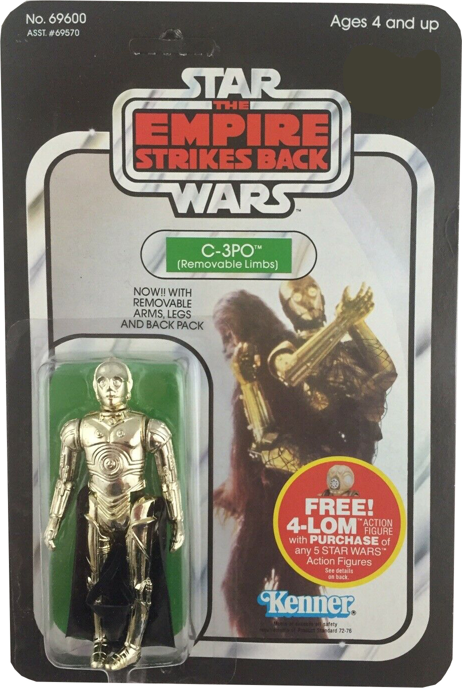 C-3PO (Removable Limbs) released in 1980 as part of the Wave 4 figures by Kenner to support the release of The Empire Strikes Back on the 45 Back card.