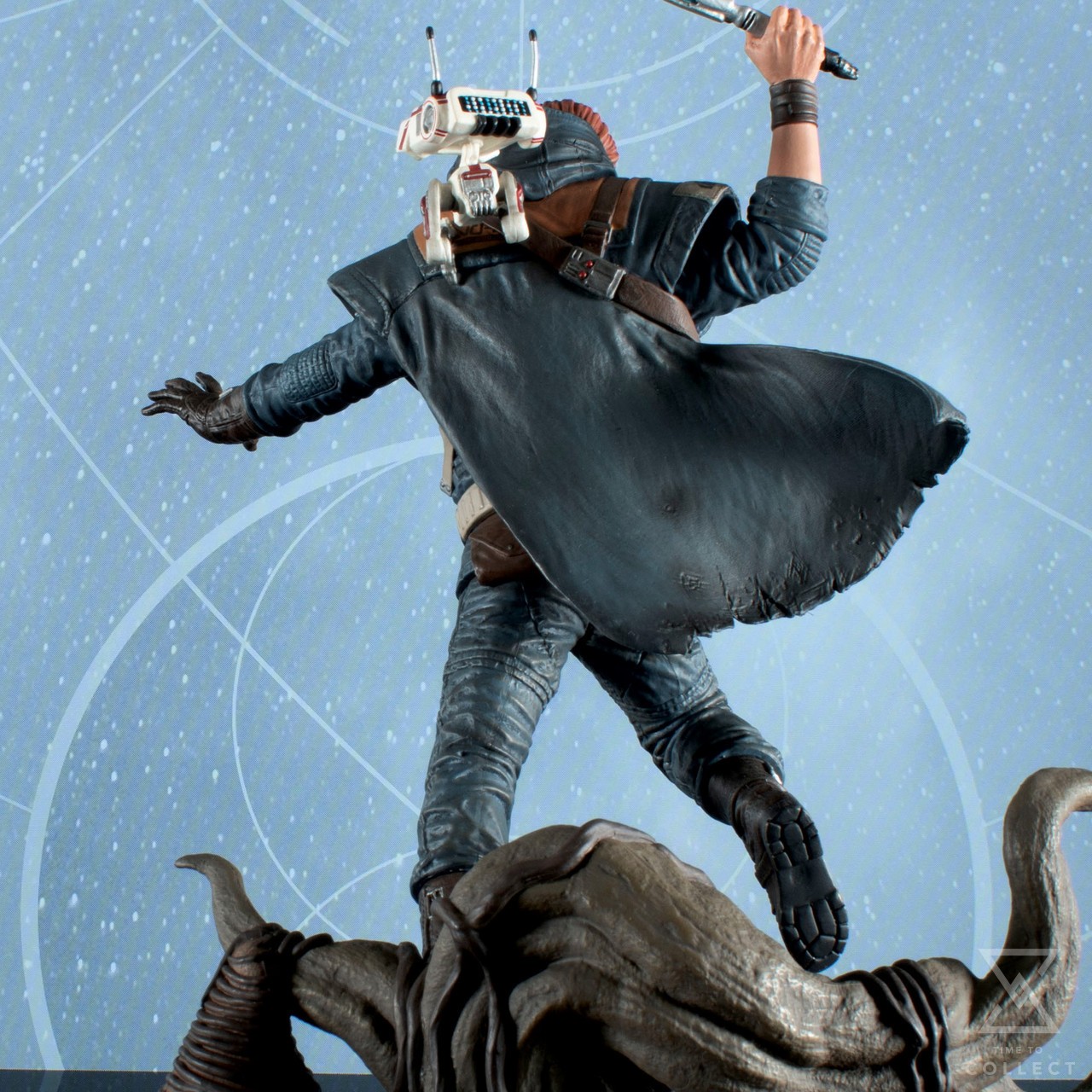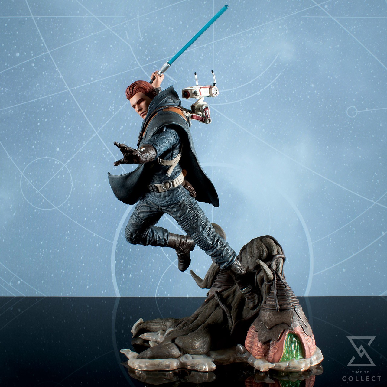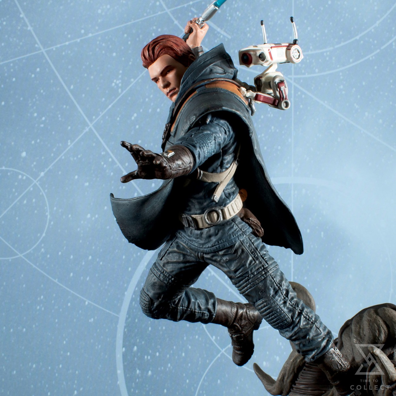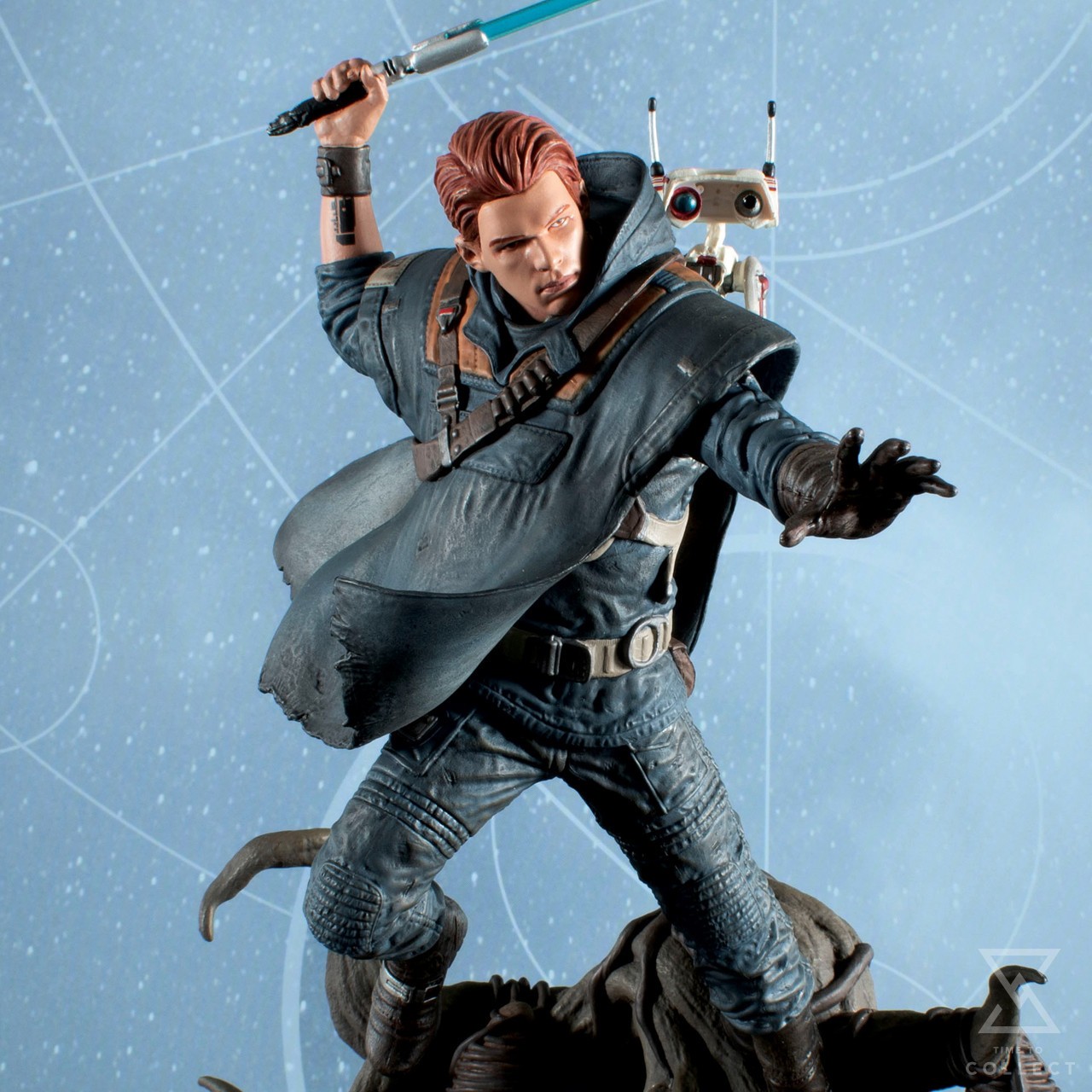 A survivor of Order 66, Jedi padawan Cal Kestis spent years living on the run until his introduction in the game Star Wars Jedi: Fallen Order. Now, this 10-inch Gallery Diorama depicts him on the move, holding aloft his blue lightsaber while carrying BD-1 on his back! Featuring detailed sculpting and paint applications, including a translucent lightsaber blade, it is made of high-quality PVC and comes packaged in a full-color window box.