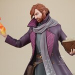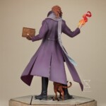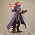 Sideshow’s Caleb Widogast Statue captures his growth and evolution through his mid-campaign appearance, accompanied by his fey familiar Frumpkin in cat form. He carries a well-read spell book and wears an eggplant purple coat with patterned lining over a dark gray tunic. Caleb’s portrait also features a kempt beard and long ginger hair tied back behind his collar. As the Mighty Nein’s studious spellcaster, he stands ready to use his flame-channeling powers in order to bring warmth and protection to his allies or to burn his enemies where they stand.