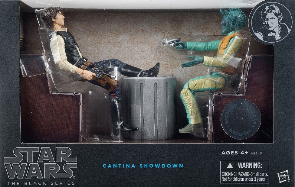 Han Solo and Greedo face off in the Mos Eisley cantina. Han has been dodging the bounty hunter for a long time, but at last Greedo has tracked him down. They sit down at a table to talk, both wary and ready for trouble. And then — blaster fire. The patrons and house band are silent for a moment before resuming their conversations and music. After all, it happens all the time in this remote corner of the lawless Outer Rim.