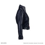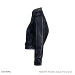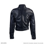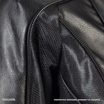 The jacket is made of faux leather and netted printed nylon. Jacket is fully lined in Widow-red satin, two front pockets, and center front zipper closures.
