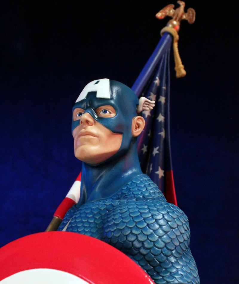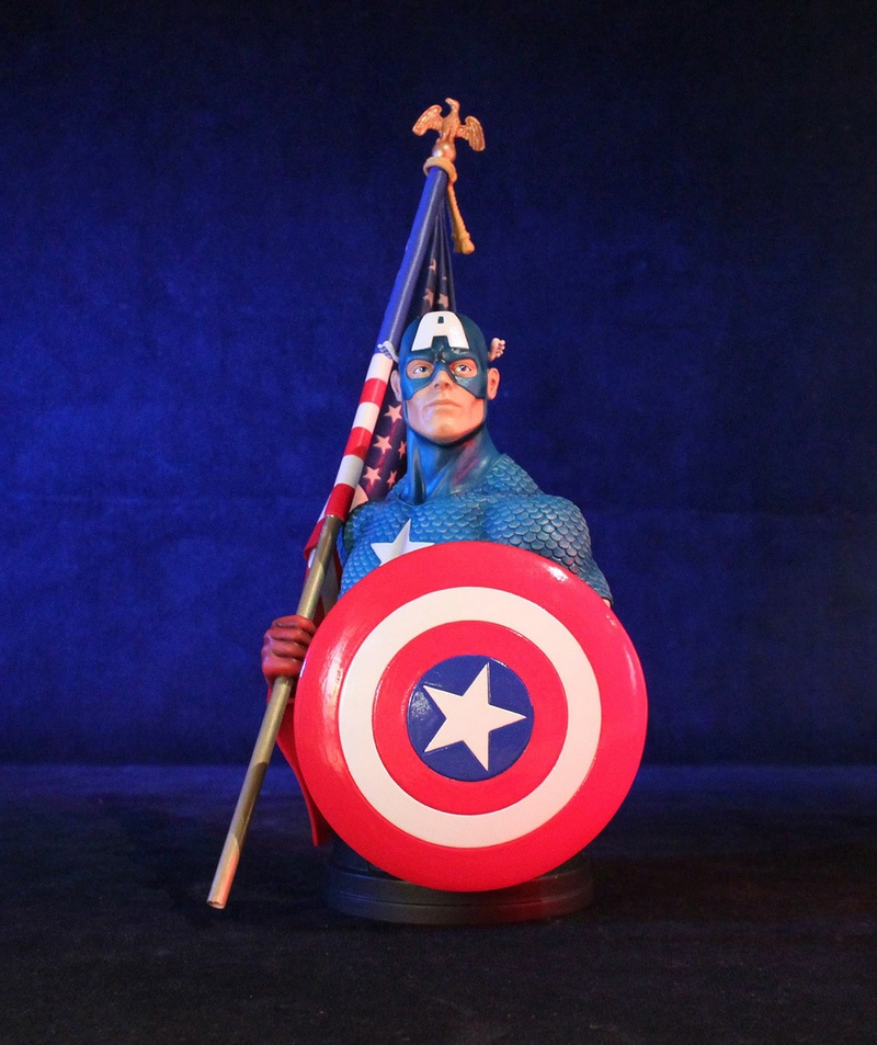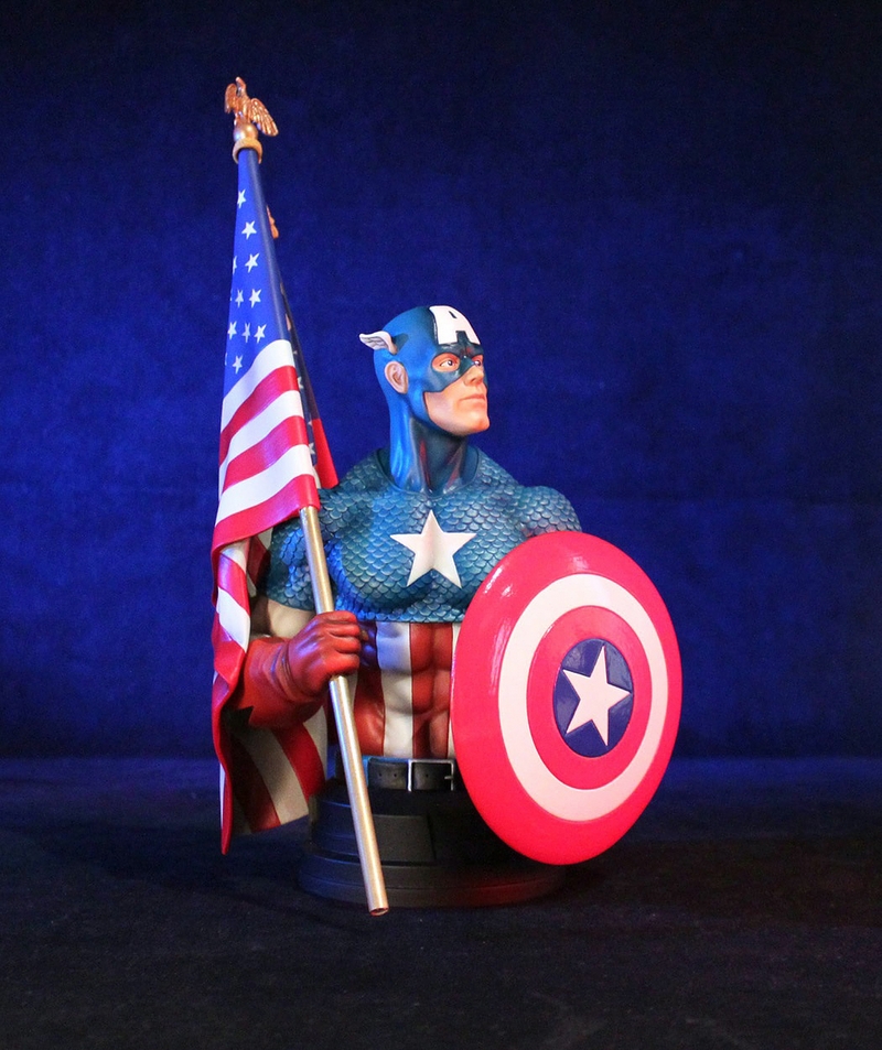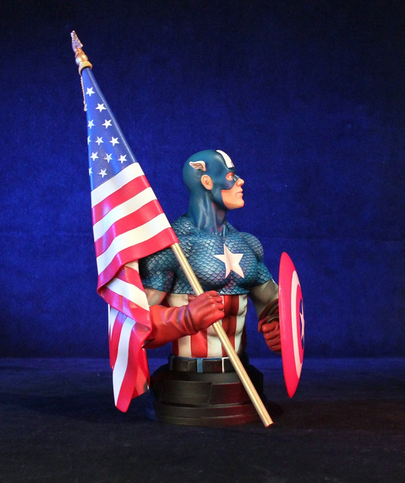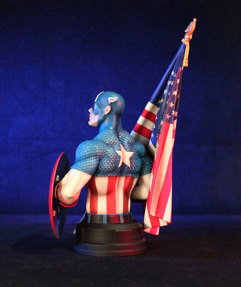 Displayed here wielding his Silver Age round shield and Old Glory, this Captain America Mini Bust is the perfect addition to any true Marvel fan’s collection. This 1/6 scale mini bust is a hand numbered limited edition collectible and comes with a matching Certificate of Authenticity.