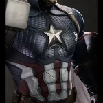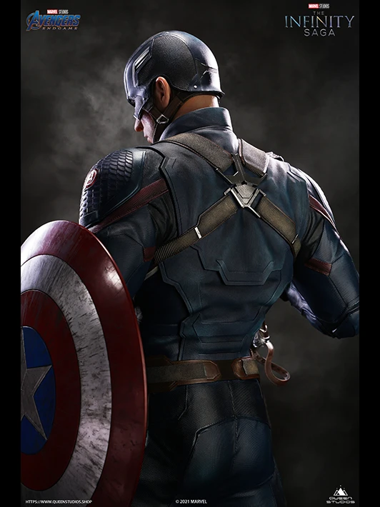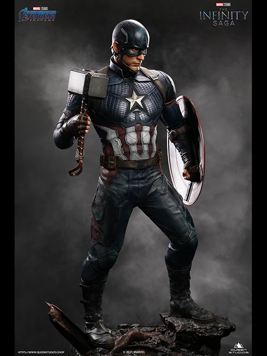 his Queen Studio 1/2 scale Captain America statue stands at 109.2cm tall. The Cap is wearing the final suit he wears in the Battle of Earth during the events of Avengers Endgame. Its colors reflect the flag of America. Red symbolizes hardiness and valor, white symbolizes purity and innocence, and blue represents vigilance. His classic star emblem sits in the centre of his chest, he is wearing his traditional ‘A’ helmet and is carrying his vibranium shield. Spoiler alert… the Cap is holding Thor’s hammer Mjölnir in his right hand. Proving once and for all that he is WORTHY!