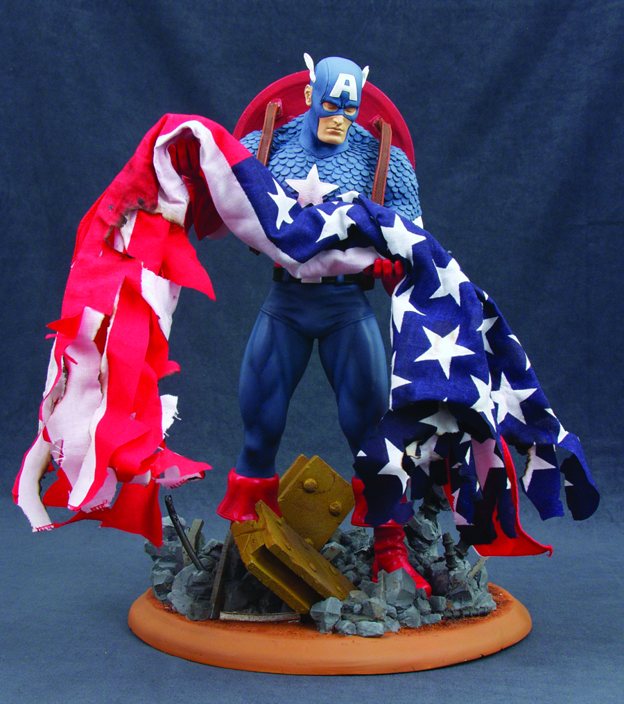 A Diamond Select Release, designed and sculpted by Art Asylum! Eli Livingston captures Captain America, the living embodiment of the American spirit in the latest Marvel Milestones statue from DST. Depicted in a rare moment of quiet contemplation, Captain America is holding a real cloth American flag. Painted and ready to display, with a full color, hand-numbered Certificate of Authenticity. Limited to 2,500 pieces worldwide.