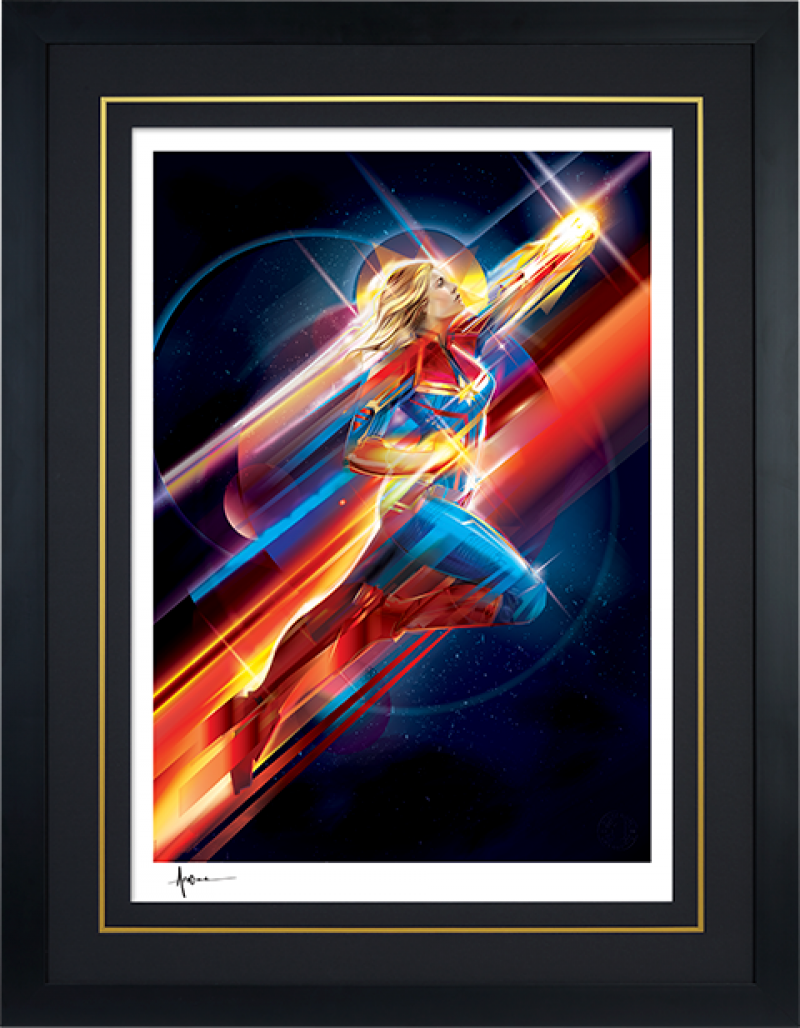 Each Higher, Further, Faster (Captain Marvel) Fine Art Print features an authorized, automated pencil signature and an embossed Seal of Authenticity as a part of the limited edition of 300 pieces. The framed edition of this fine art collectible features a black or white frame option and a custom double mat to push your Marvel art collection to new heights.