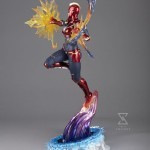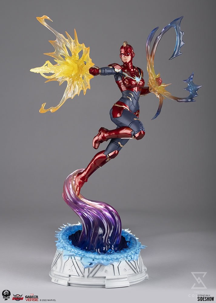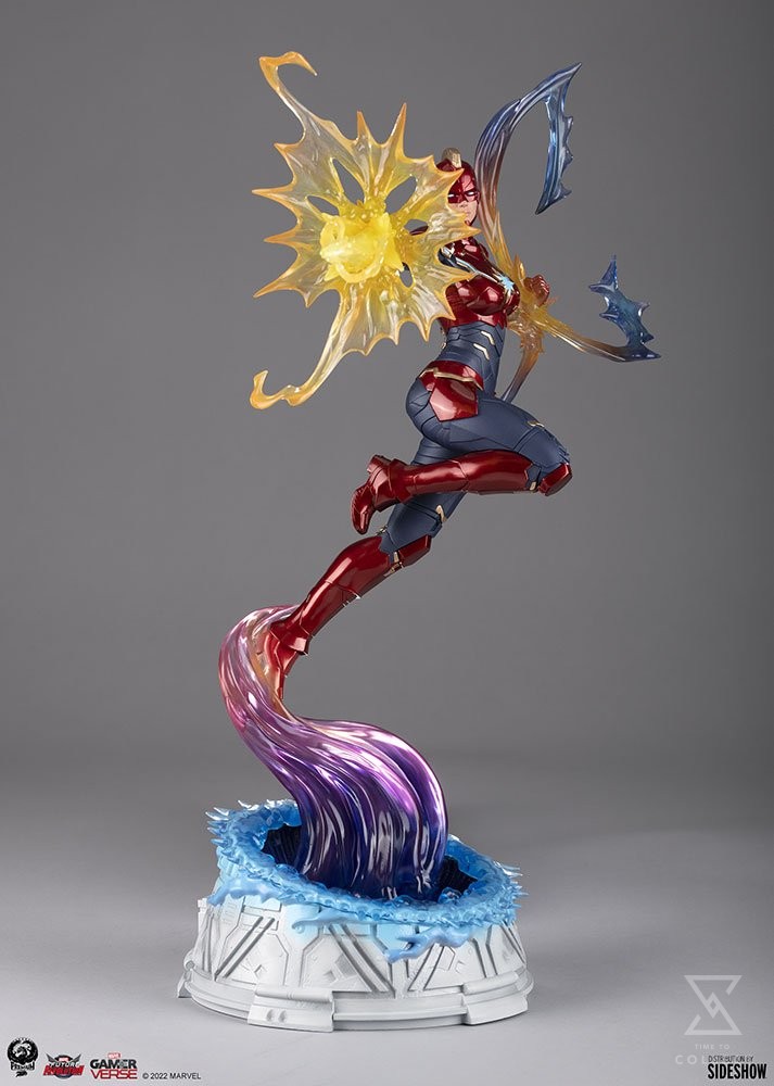 The Captain Marvel 1:6 Scale Statue measures 19.5” tall and 15” wide, inspired by her super heroic appearance in the open-world action RPG MARVEL Future Revolution. Carol Danvers pushes herself higher, further, faster as she flies above an interdimensional portal base, charging up her fists to unleash a powerful photon blast. The colorful cosmic energy radiating from Captain Marvel is translucent to give added visual dimension to the display.
