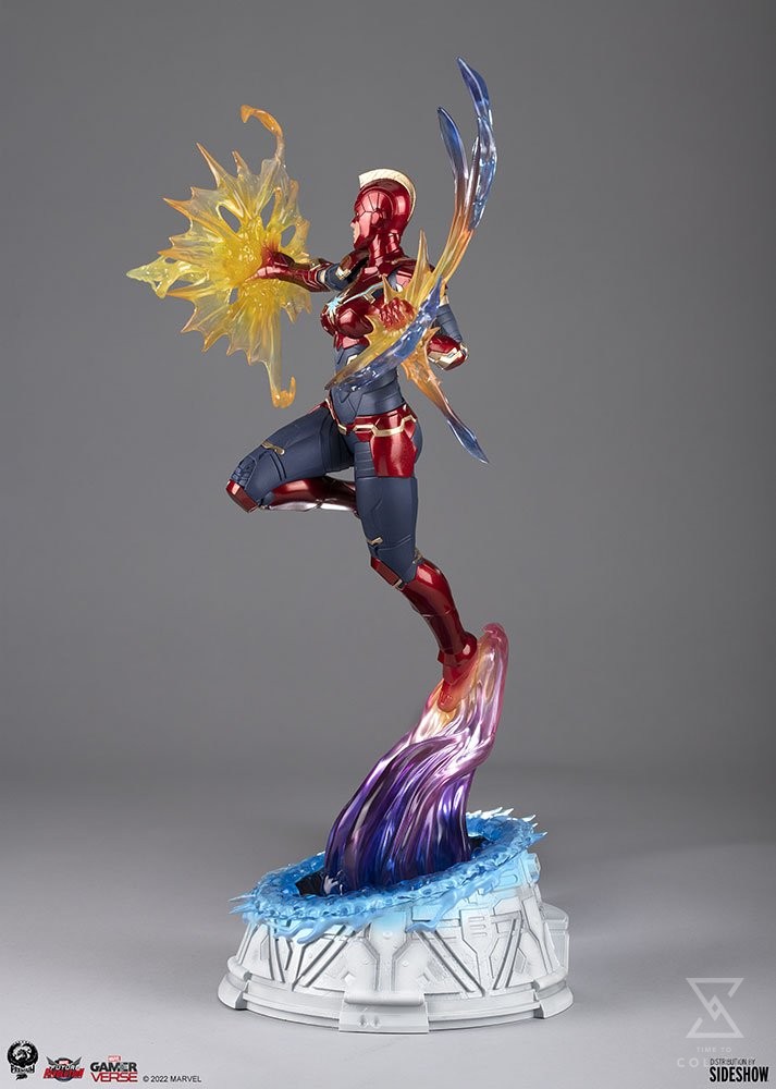 The Captain Marvel Statue is fully sculpted with a design based off of her more tactical New Stark City costume as seen in the game. Her signature red, blue, and gold color scheme features metallic accents and a blue Hala star on her chest. Carol’s red helmeted portrait shows her fierce determination and calm under fire, with blue eyes and a gold faux-mohawk attachment at the top to mimic her blonde hairstyle. Powerful and poised, Captain Marvel is ready to take on threats in every dimension alongside her Avengers allies.