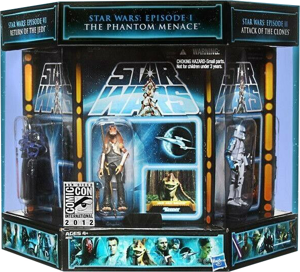 Includes Jar Jar Binks, Clone Trooper Lieutenant, Shock Trooper, Sandtrooper, Princess Leia, Darth Vader and a new figure, Jar Jar Vinks in Carbonite.
