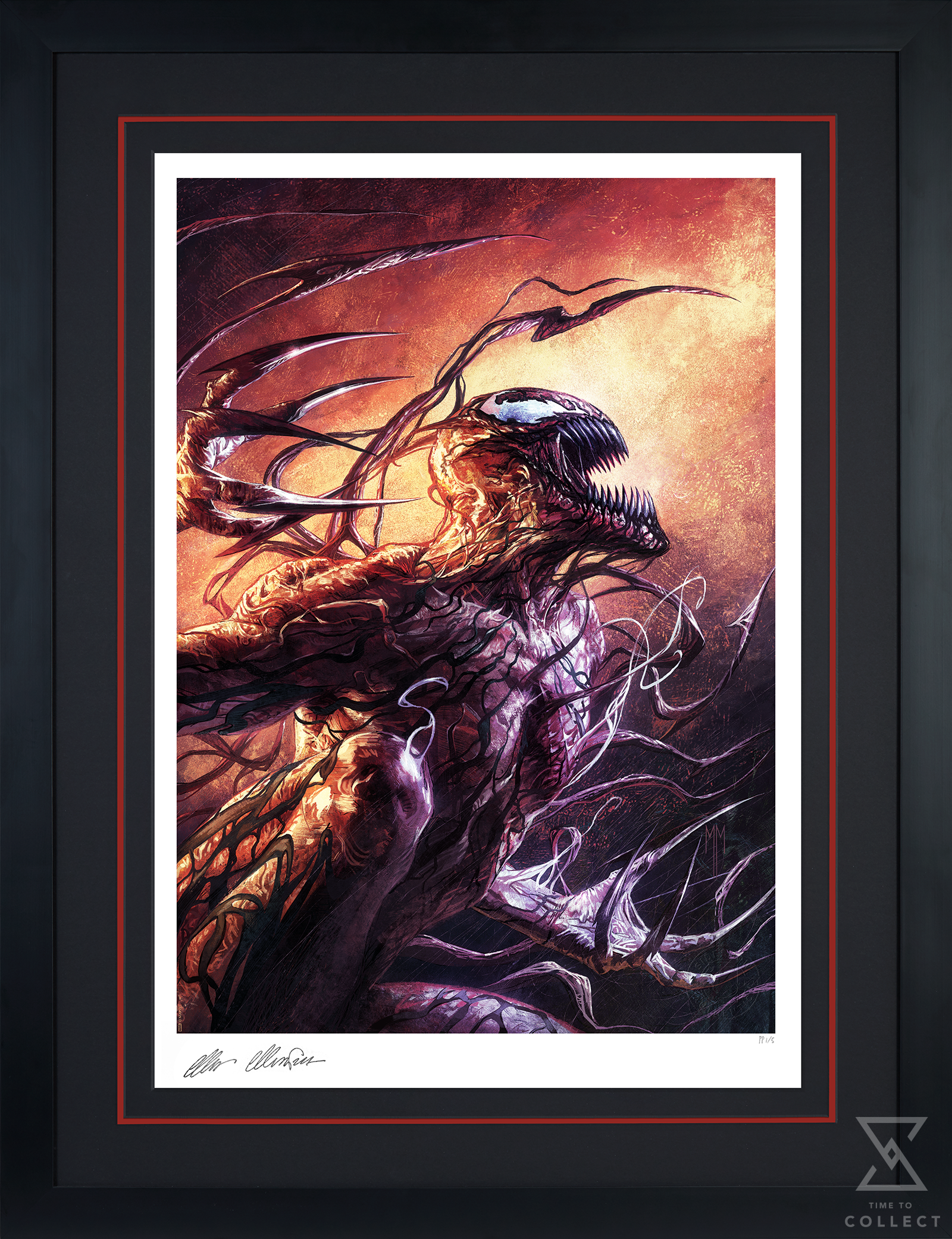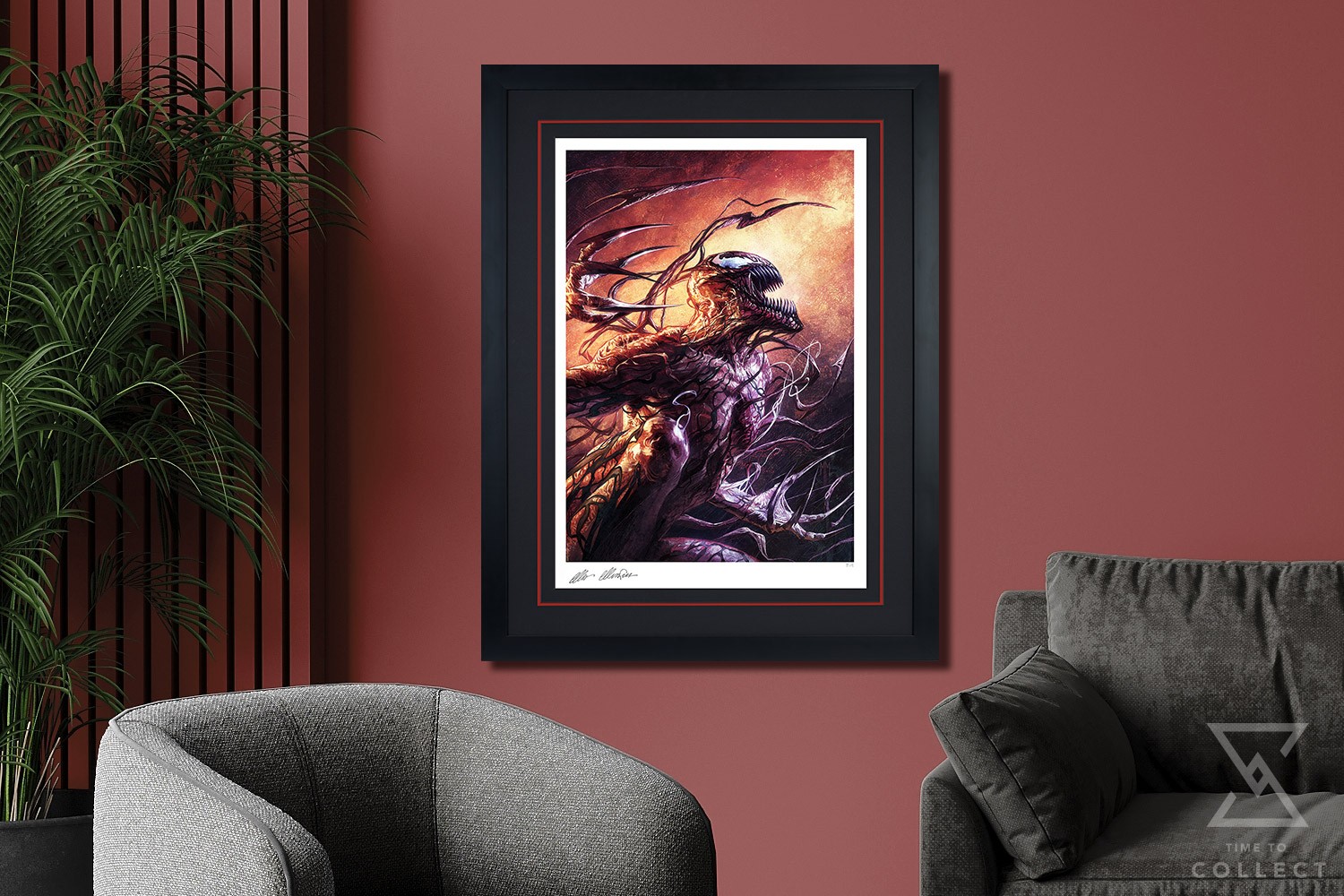 Originally created as a variant cover for Carnage #11 (2023), written by Alex Paknadel for Marvel Comics, this comic book artwork is now available for fans in an unframed giclée or custom framed collectible presentation. Each Carnage Fine Art Print features an authorized, automated artist signature and an embossed Seal of Authenticity as a part of the limited edition of 250 pieces. Spider-Man art collectors won’t want to miss hosting this sinister symbiote in their collection!