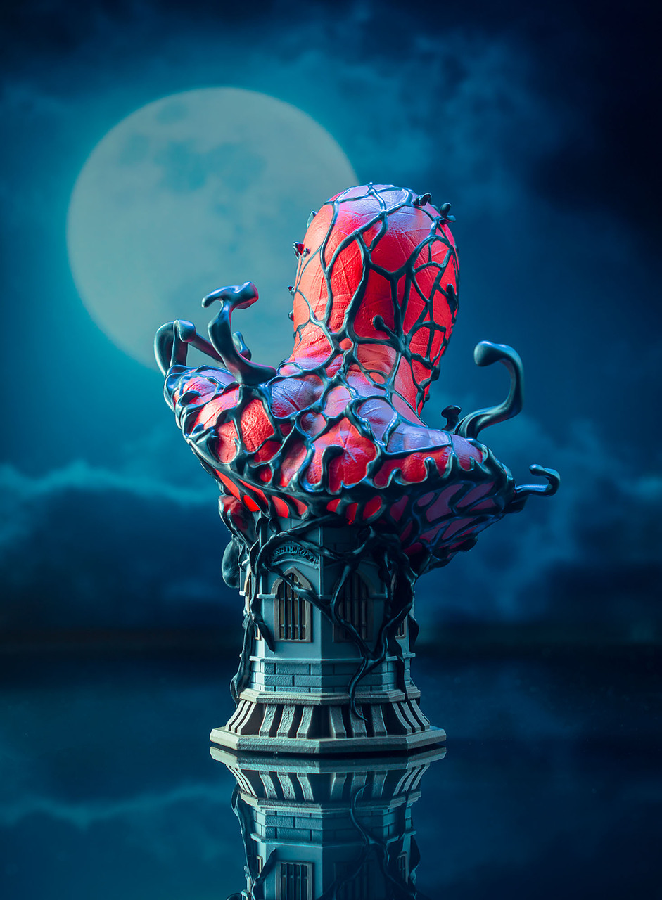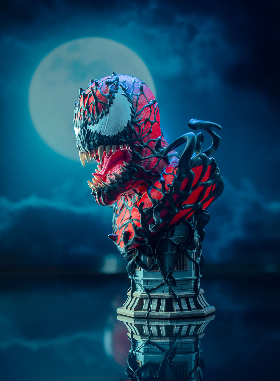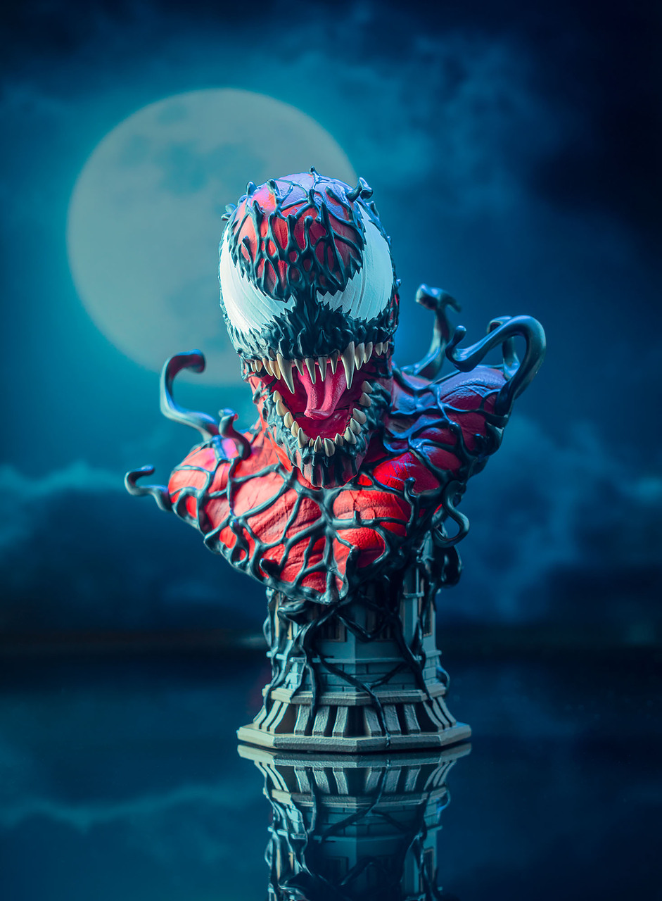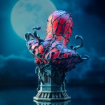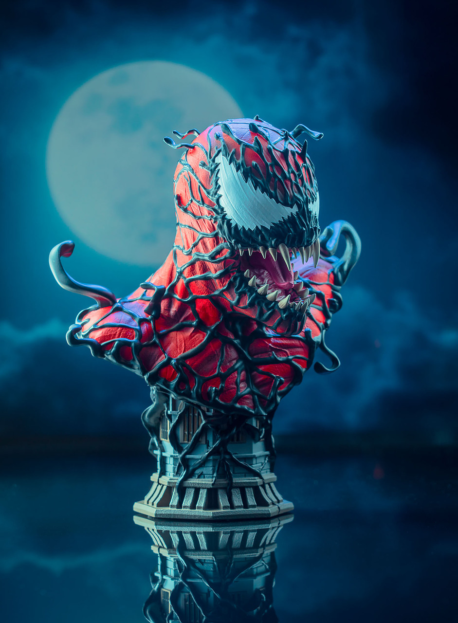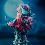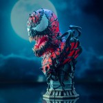 Measuring approximately 10″ tall, this half-scale bust of Carnage is the latest in the Legends in 3D line. Based on his comic appearance, Carnage bares his teeth as tendrils of symbiote grip his architectural pedestal!