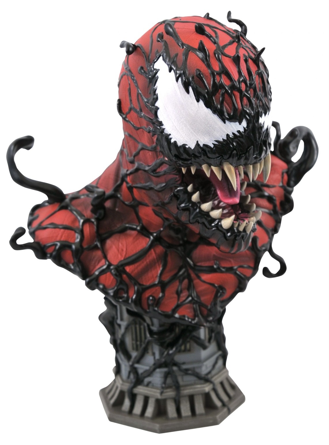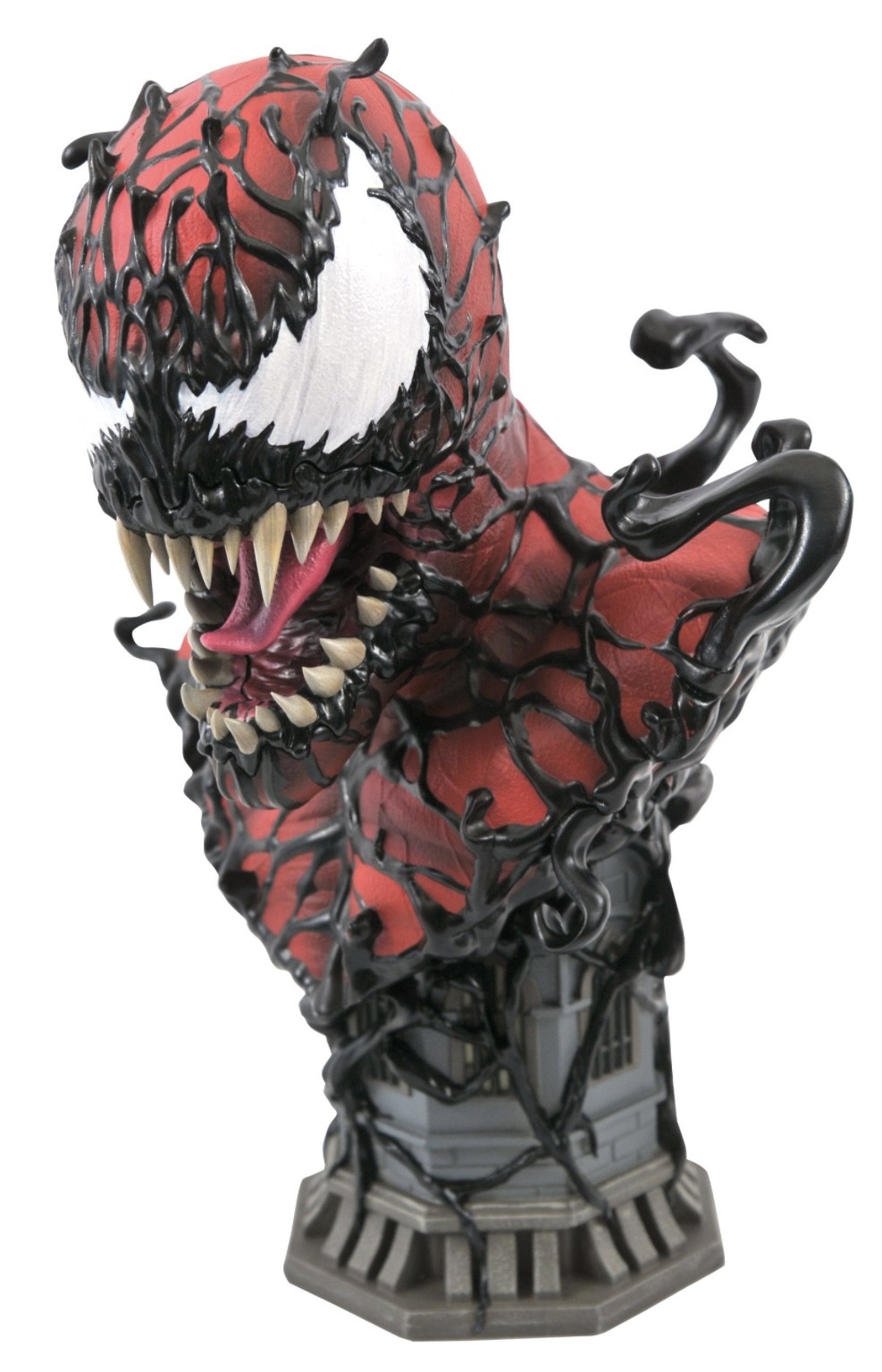 A Diamond Select Toys release! We’ve reached maximum Carnage! Measuring approximately 10 inches tall, this half-scale bust of Carnage is the latest in the Legends in 3D line. Based on his comic appearance, Carnage bares his teeth as tendrils of symbiote grip his architectural pedestal! Measuring approximately 10 inches tall, he features detailed sculpting and paint applications, and comes packaged in a full-color box with a numbered certificate of authenticity. Limited to 1,000 pieces. Designed by Joe Allard, sculpted by Rocco Tartamella!