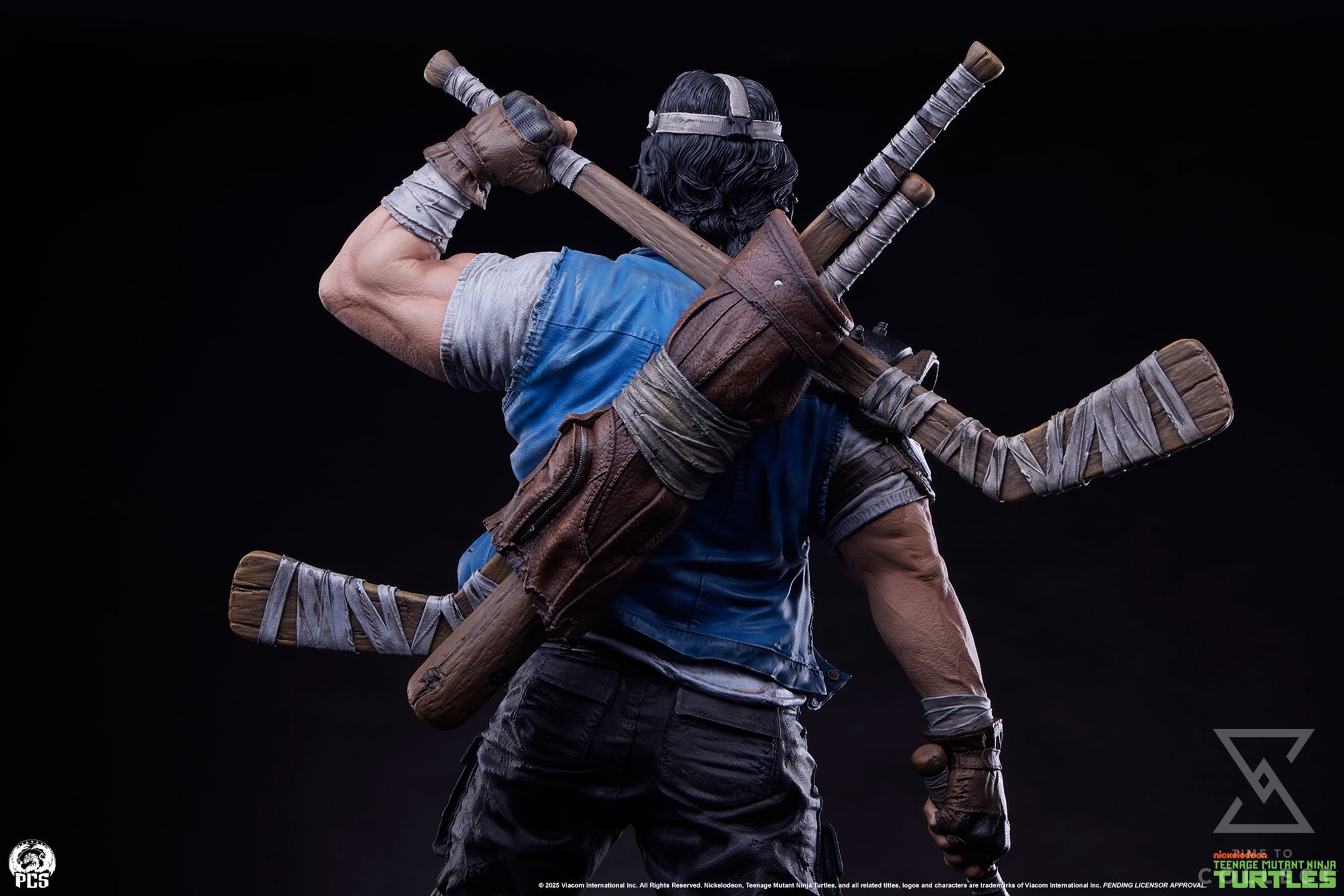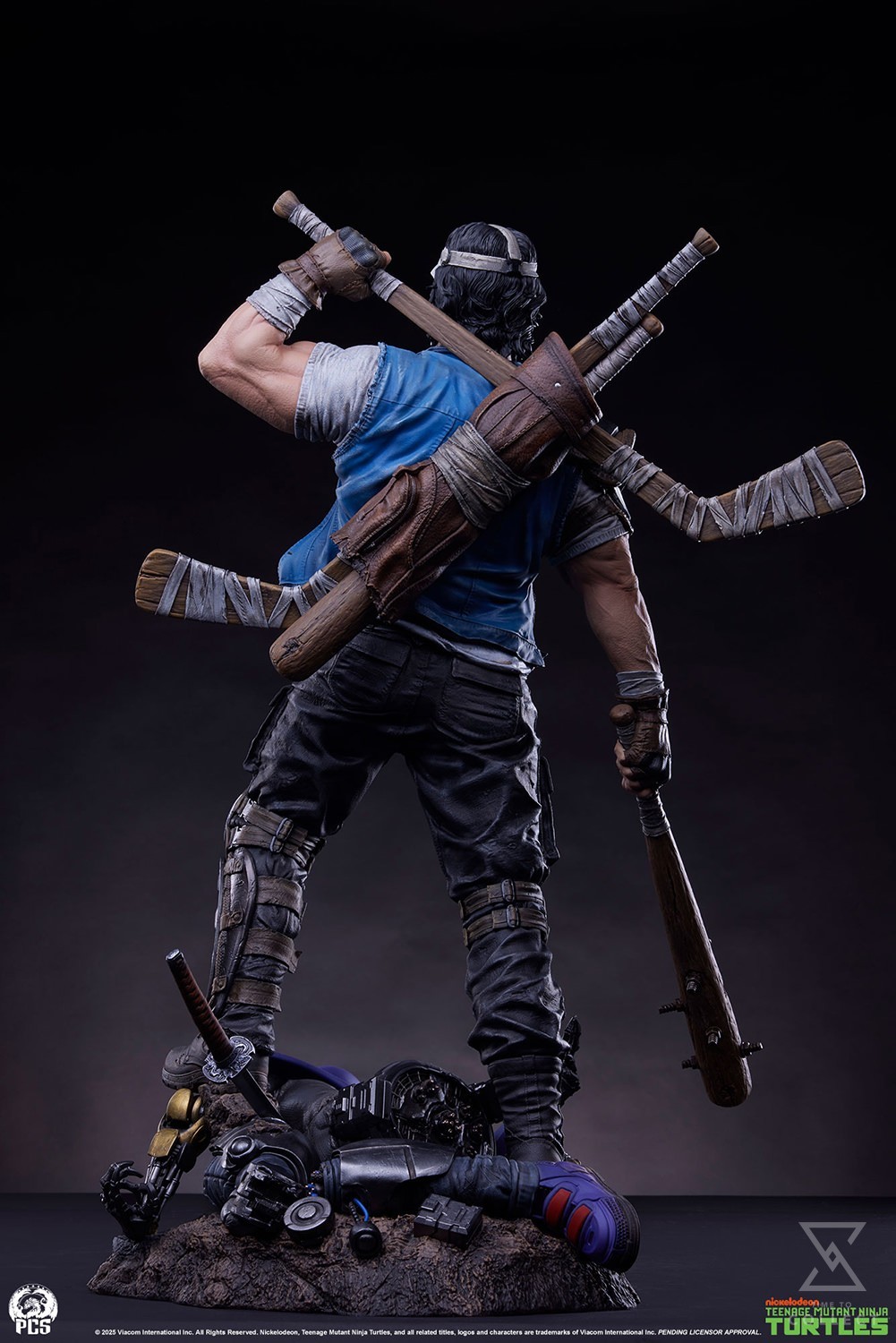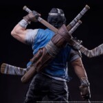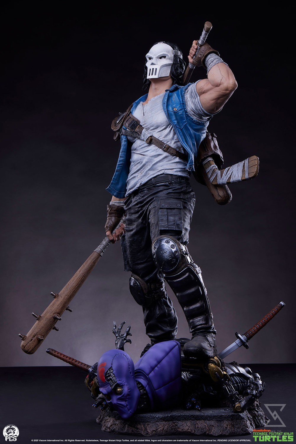 The Casey Jones 1:3 Scale Statue measures 25.5” tall and nearly 17” wide depicting the masked vigilante standing victorious over a defeated robotic Foot Clan grunt. Armed with an arsenal of athletic accessories, Casey is ready for whatever the mean streets of NYC can throw at him. The heavily modified golf bag slung over his shoulder features life-like sculpted leather textures and is stuffed with heavily taped-up hockey sticks and baseball bats. His well worn clothing and battle damaged protective gear are indicative of his singular focus and commitment to brutal street justice.
