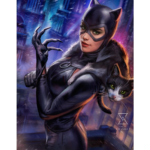 Cat got your tongue? In the Catwoman #21 Fine Art Print, Catwoman and her feline companion peer out at the viewer with their matching emerald eyes. Selina Kyle’s clawed gloves glimmer in the winter storm as she stands in front of a city skyline flashing with brilliant lights of sapphire and ruby.